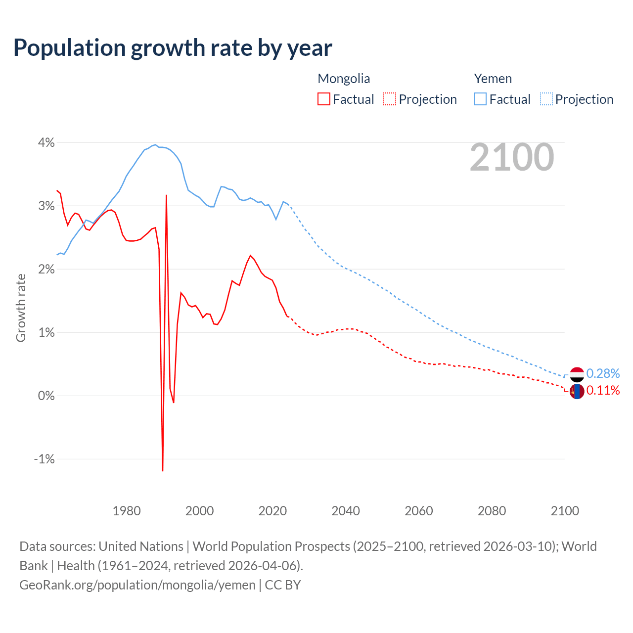 - For the last 10 years, Mongolia has had an average growth rate of +1.79% per year vs +3% in Yemen.