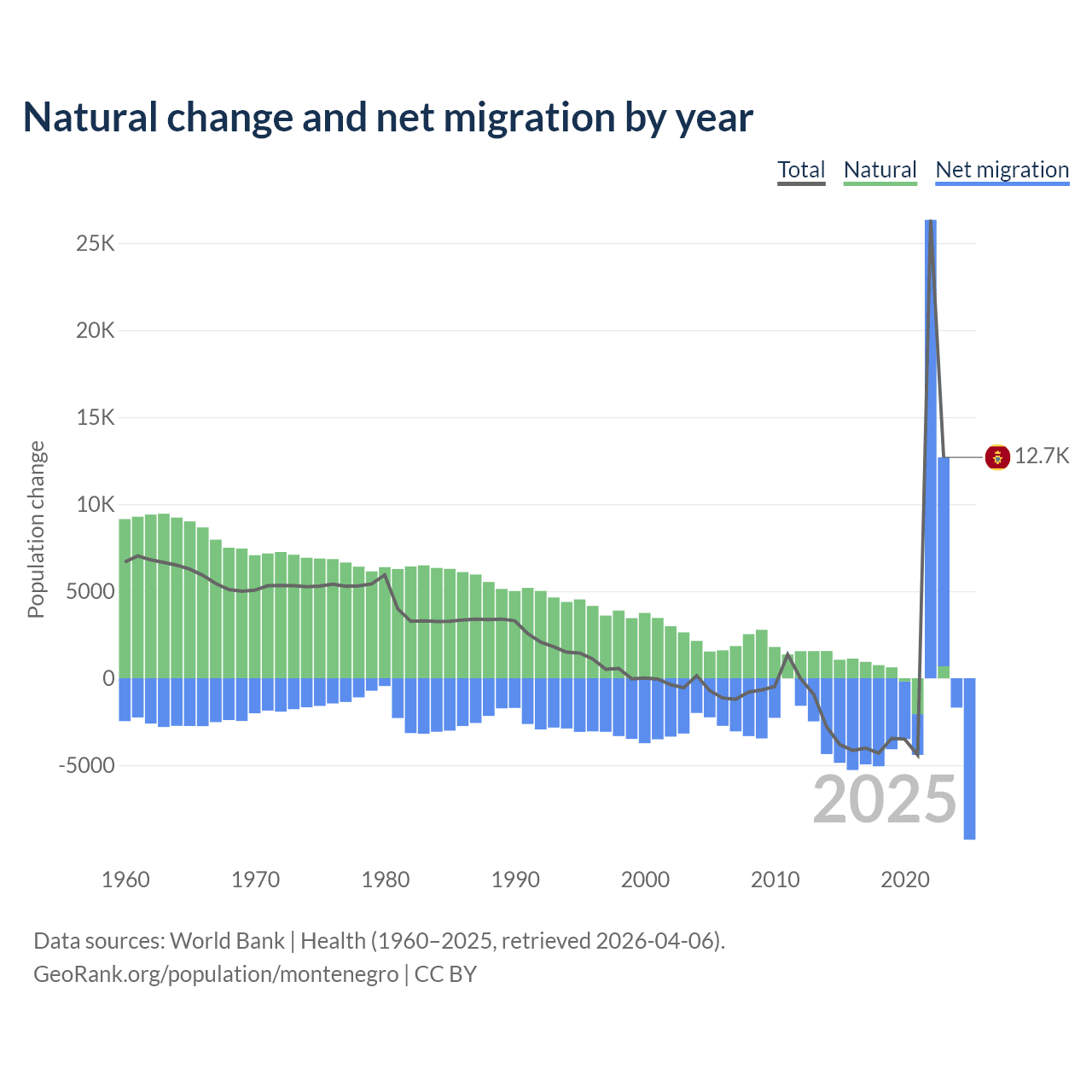 - For the last 20 years, Montenegro has had an average decline rate of -0.02% per year.