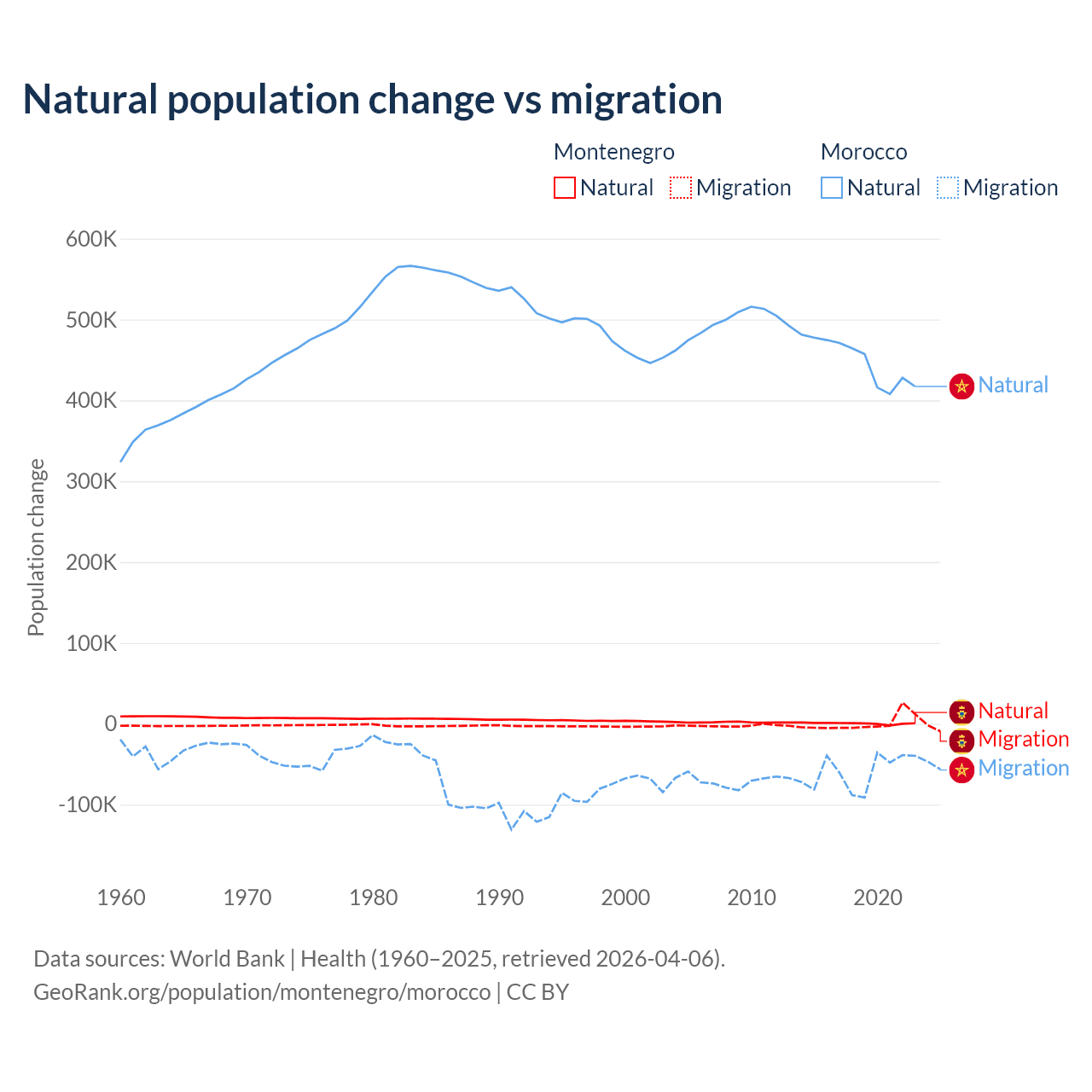 Over the last 10 years, 52.4% of the population change in Montenegro is from natural causes (a gain of 4,501 people) and 47.6% is from migration (a gain of 4,095 people). In Morocco 88.3% is from natural causes (a gain of 4,495,223 people) and 11.7% is from migration (a loss of 594,083 people).