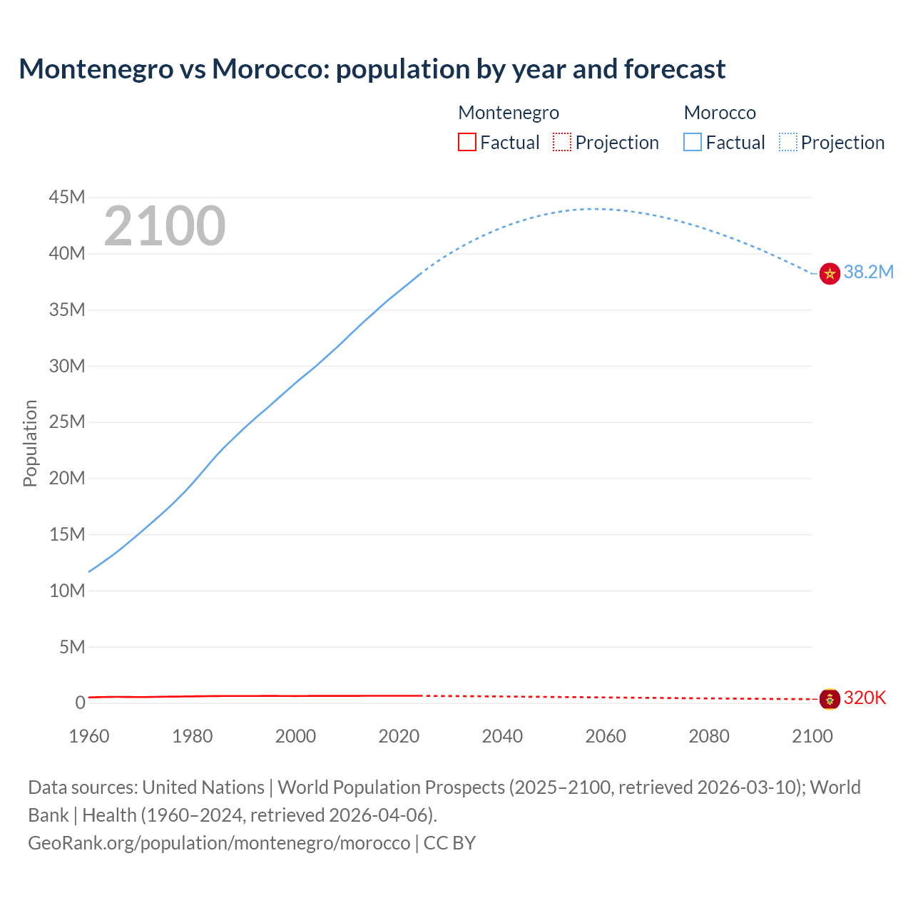 Montenegro vs Morocco: population by year and forecast