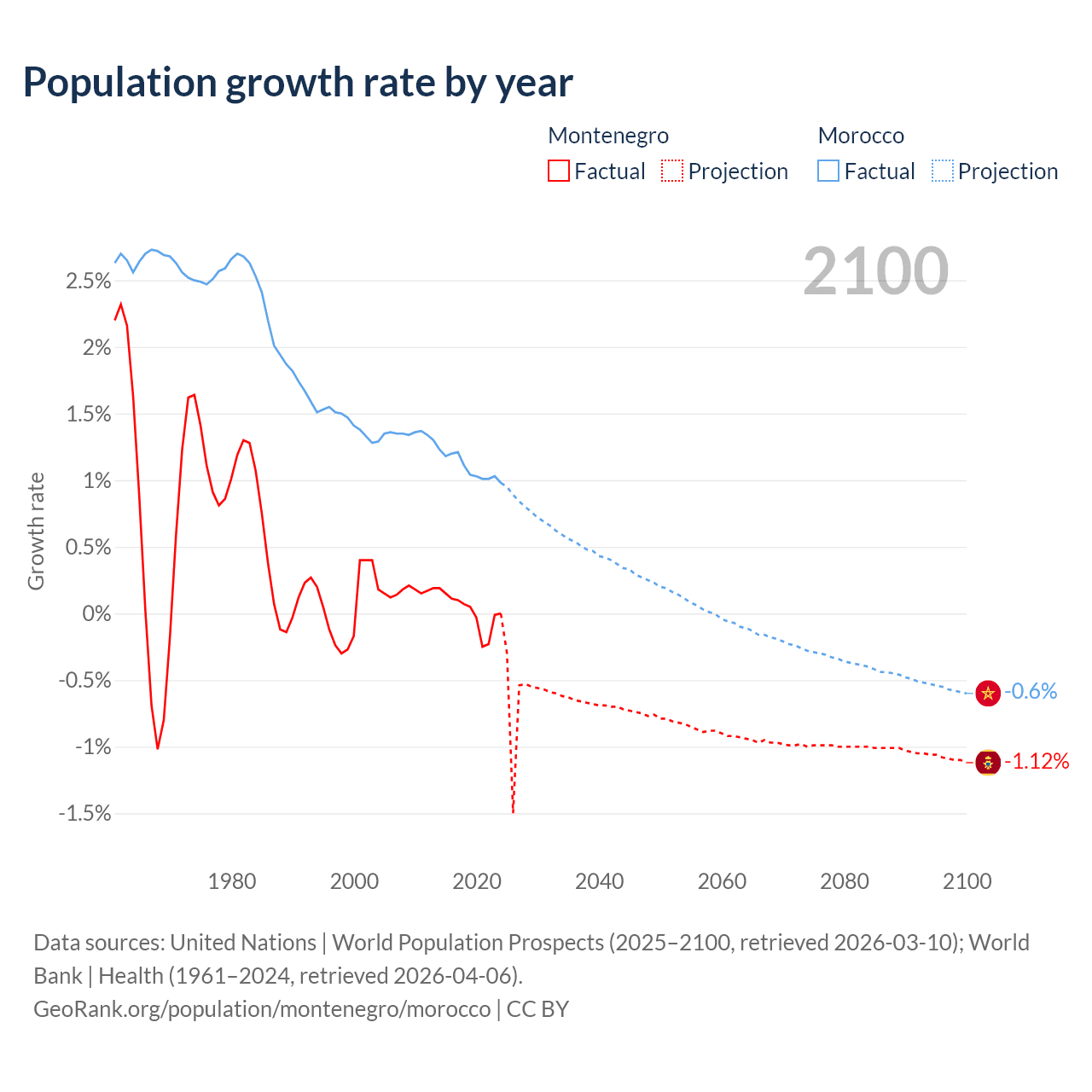 - For the last 10 years, Montenegro has had an average growth rate of +0.01% per year vs +1.09% in Morocco.