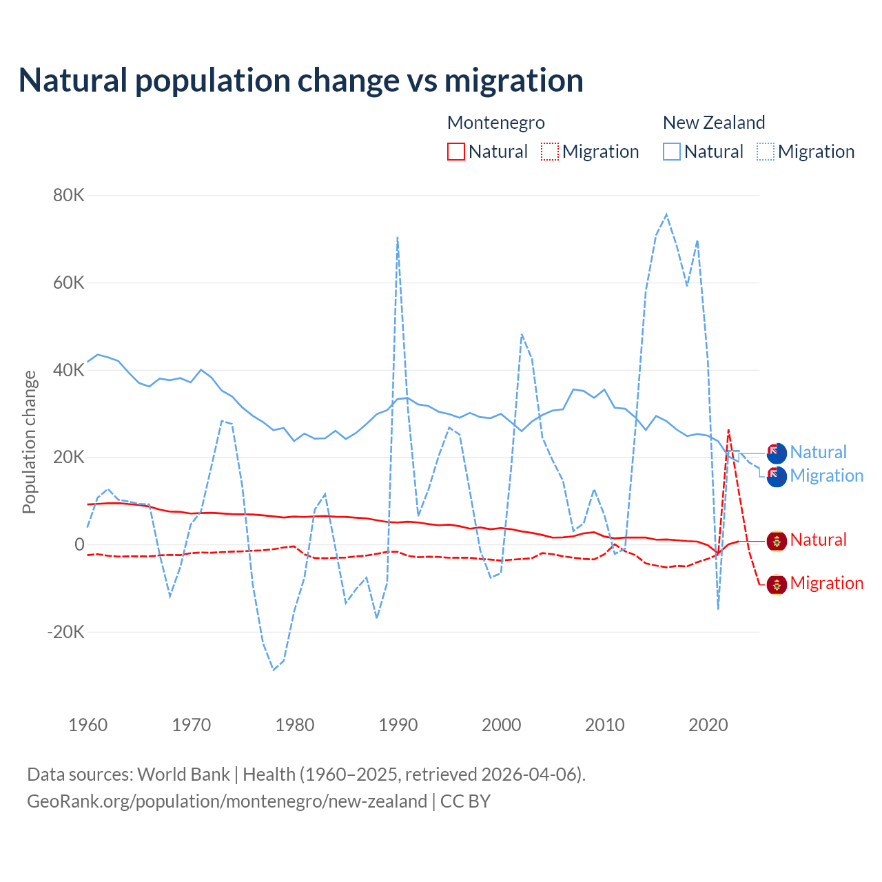 Over the last 10 years, 52.4% of the population change in Montenegro is from natural causes (a gain of 4,501 people) and 47.6% is from migration (a gain of 4,095 people). In New Zealand 34.4% is from natural causes (a gain of 247,767 people) and 65.6% is from migration (a gain of 471,602 people).