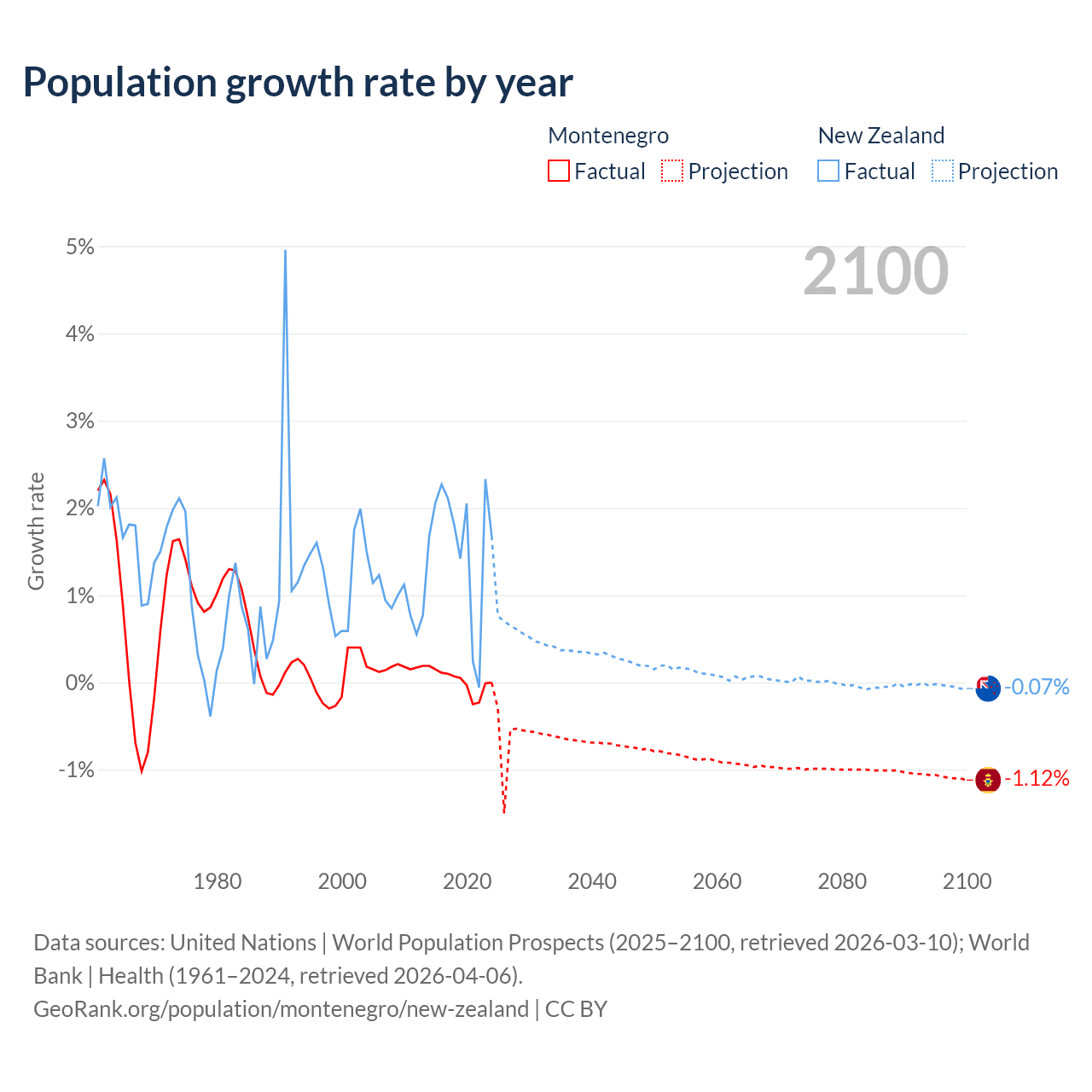 - For the last 10 years, Montenegro has had an average growth rate of +0.01% per year vs +1.6% in New Zealand.