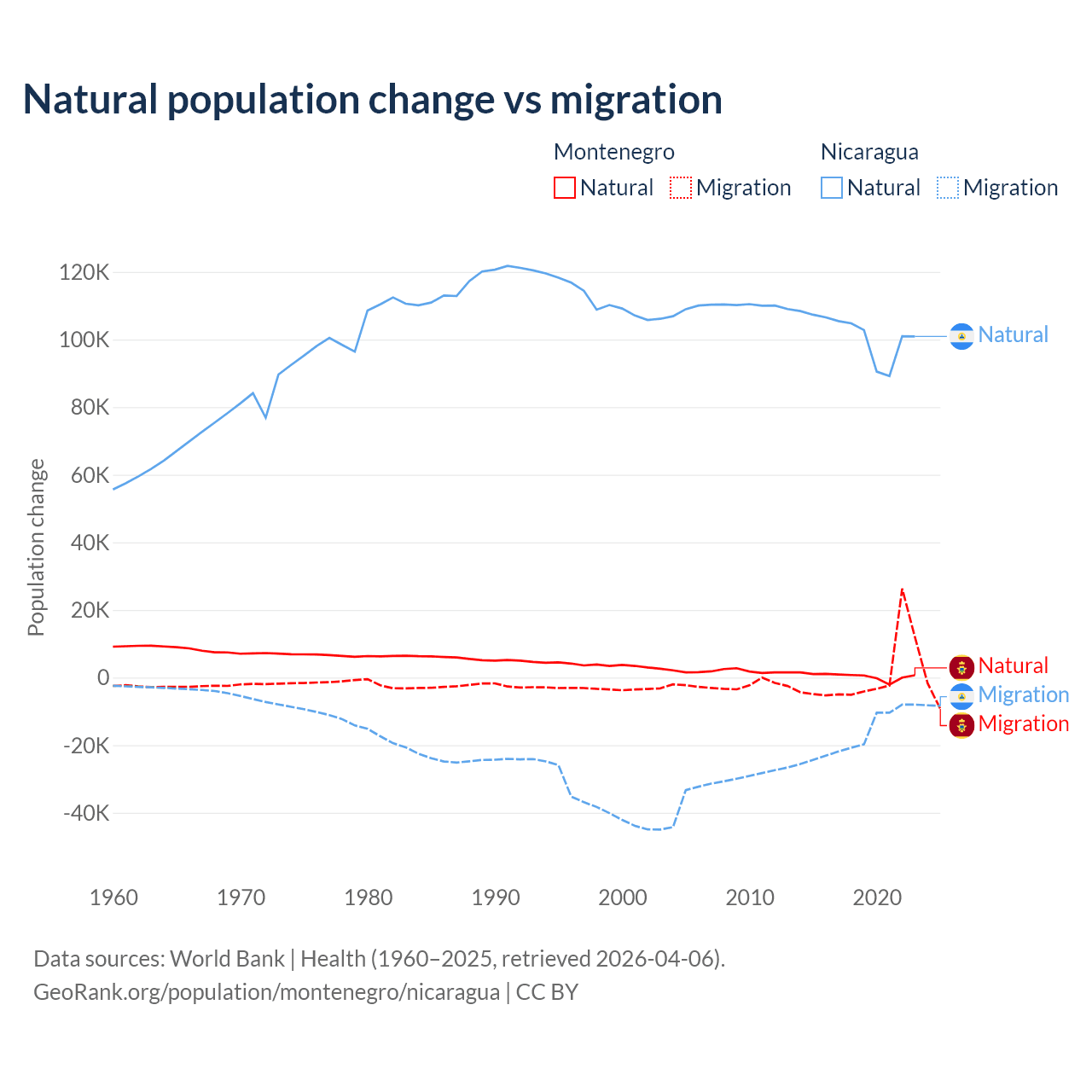 Over the last 10 years, 52.4% of the population change in Montenegro is from natural causes (a gain of 4,501 people) and 47.6% is from migration (a gain of 4,095 people). In Nicaragua 85.5% is from natural causes (a gain of 1,017,084 people) and 14.5% is from migration (a loss of 172,078 people).