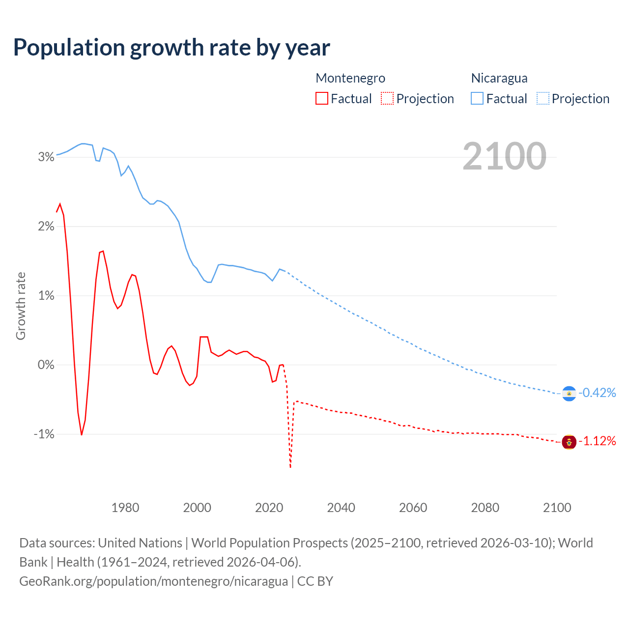 - For the last 10 years, Montenegro has had an average growth rate of +0.01% per year vs +1.33% in Nicaragua.