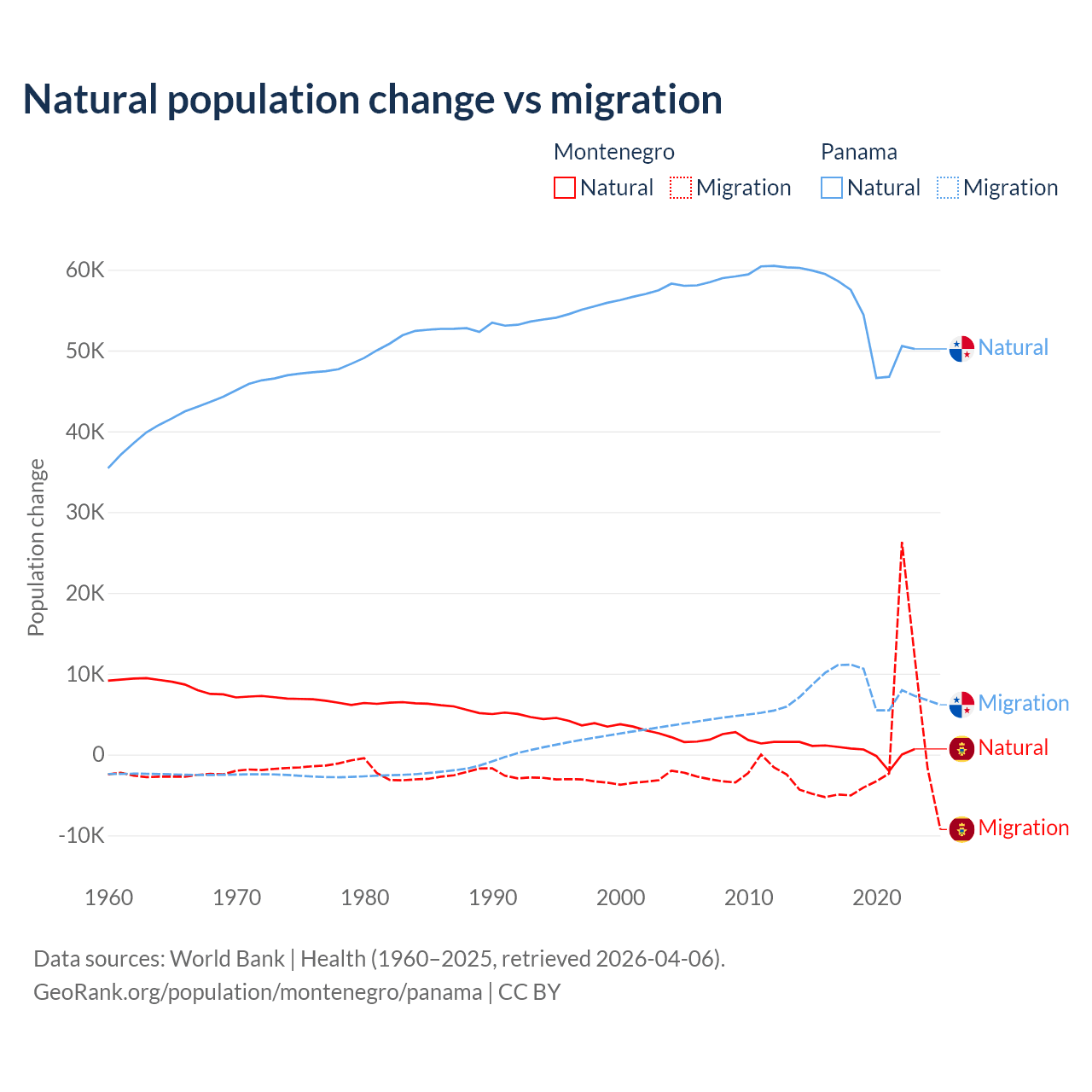 Over the last 10 years, 52.4% of the population change in Montenegro is from natural causes (a gain of 4,501 people) and 47.6% is from migration (a gain of 4,095 people). In Panama 86.5% is from natural causes (a gain of 544,211 people) and 13.5% is from migration (a gain of 84,849 people).