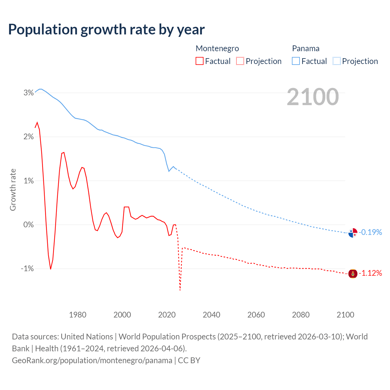 - For the last 10 years, Montenegro has had an average growth rate of +0.01% per year vs +1.52% in Panama.