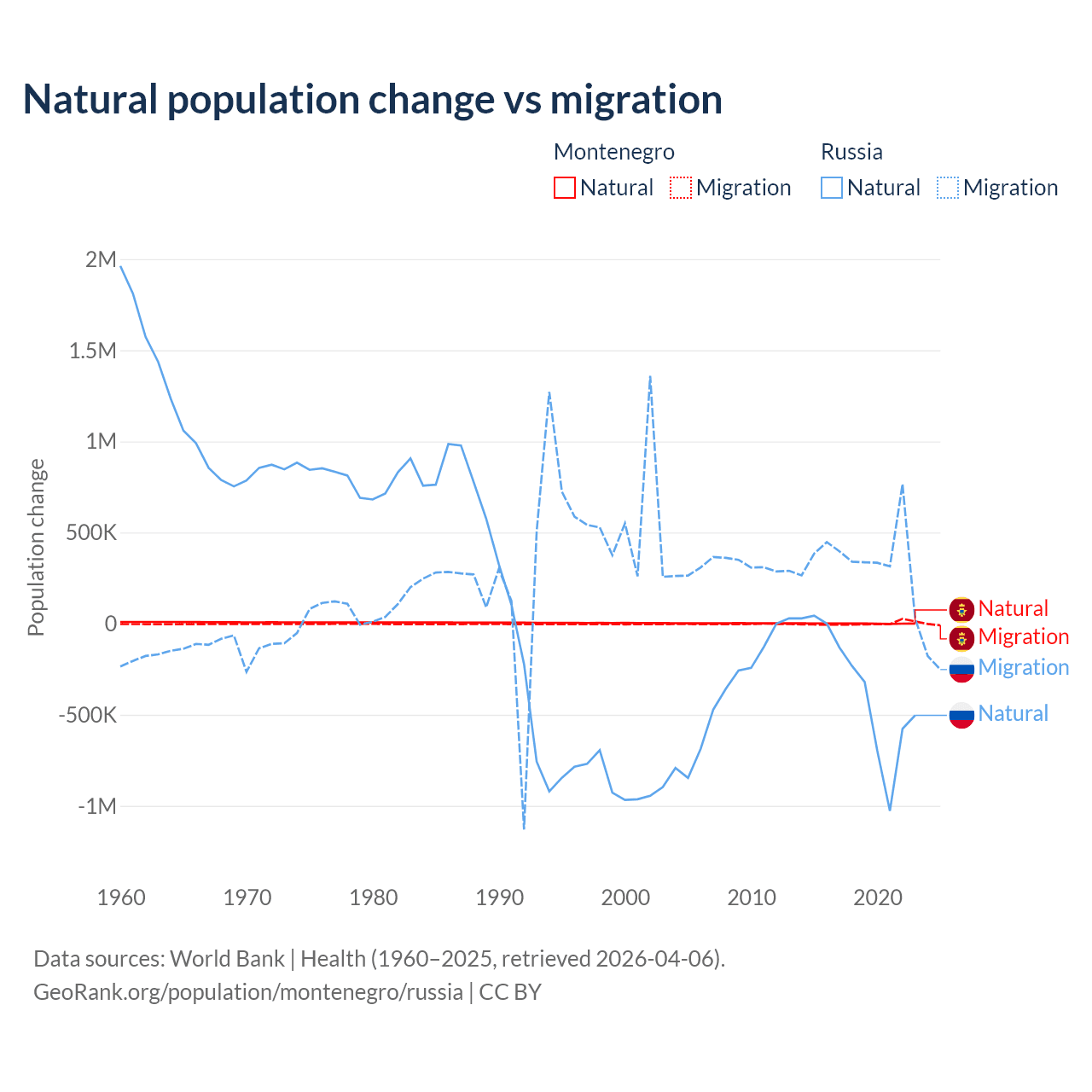 Over the last 10 years, 52.4% of the population change in Montenegro is from natural causes (a gain of 4,501 people) and 47.6% is from migration (a gain of 4,095 people). In Russia 48.6% is from natural causes (a loss of 3,416,377 people) and 51.4% is from migration (a gain of 3,611,826 people).