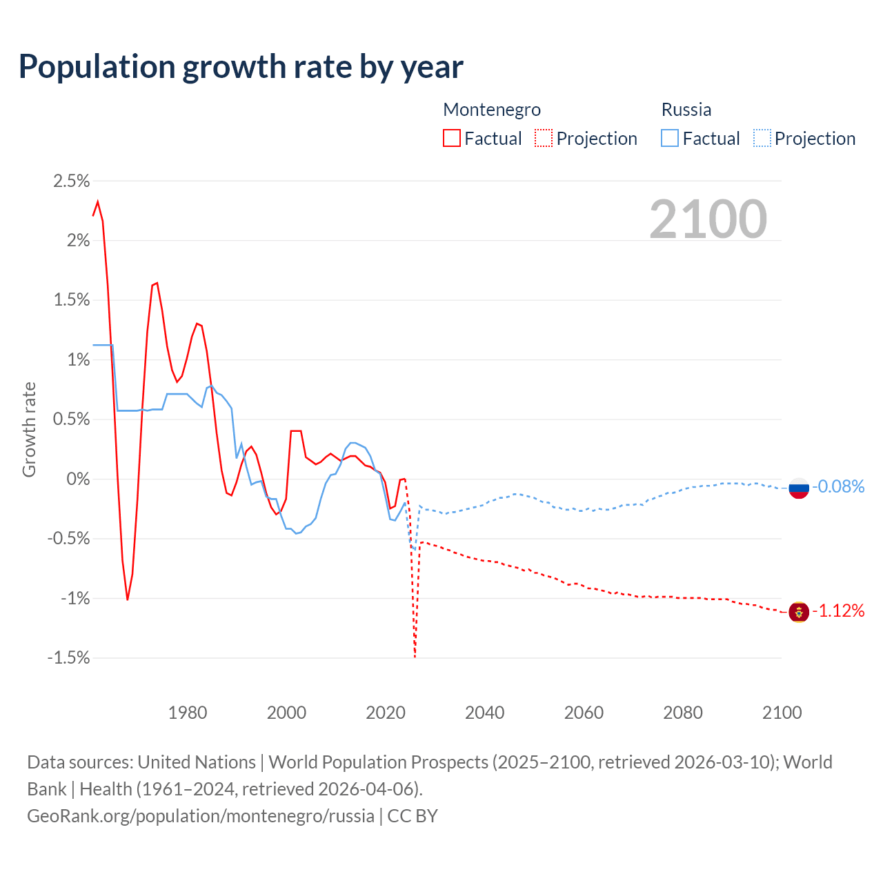 - For the last 10 years, Montenegro has had an average growth rate of +0.01% per year vs -0.02% in Russia.