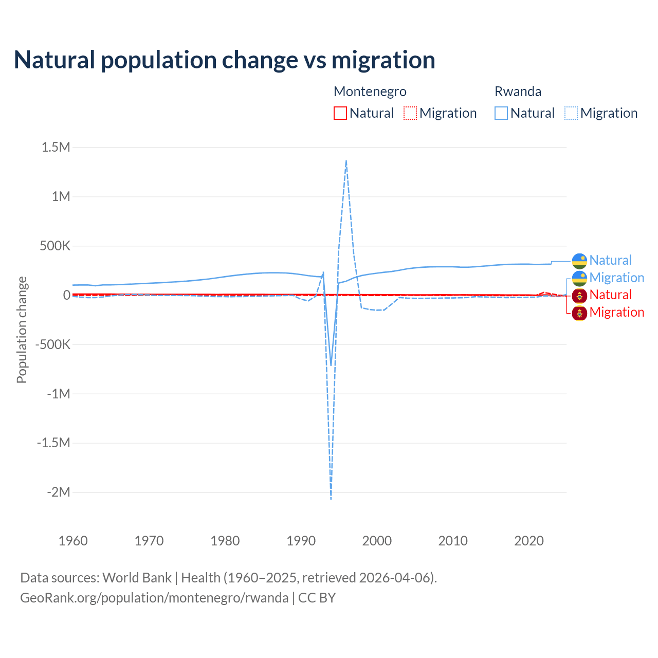 Over the last 10 years, 52.4% of the population change in Montenegro is from natural causes (a gain of 4,501 people) and 47.6% is from migration (a gain of 4,095 people). In Rwanda 93.8% is from natural causes (a gain of 3,081,296 people) and 6.18% is from migration (a loss of 203,035 people).