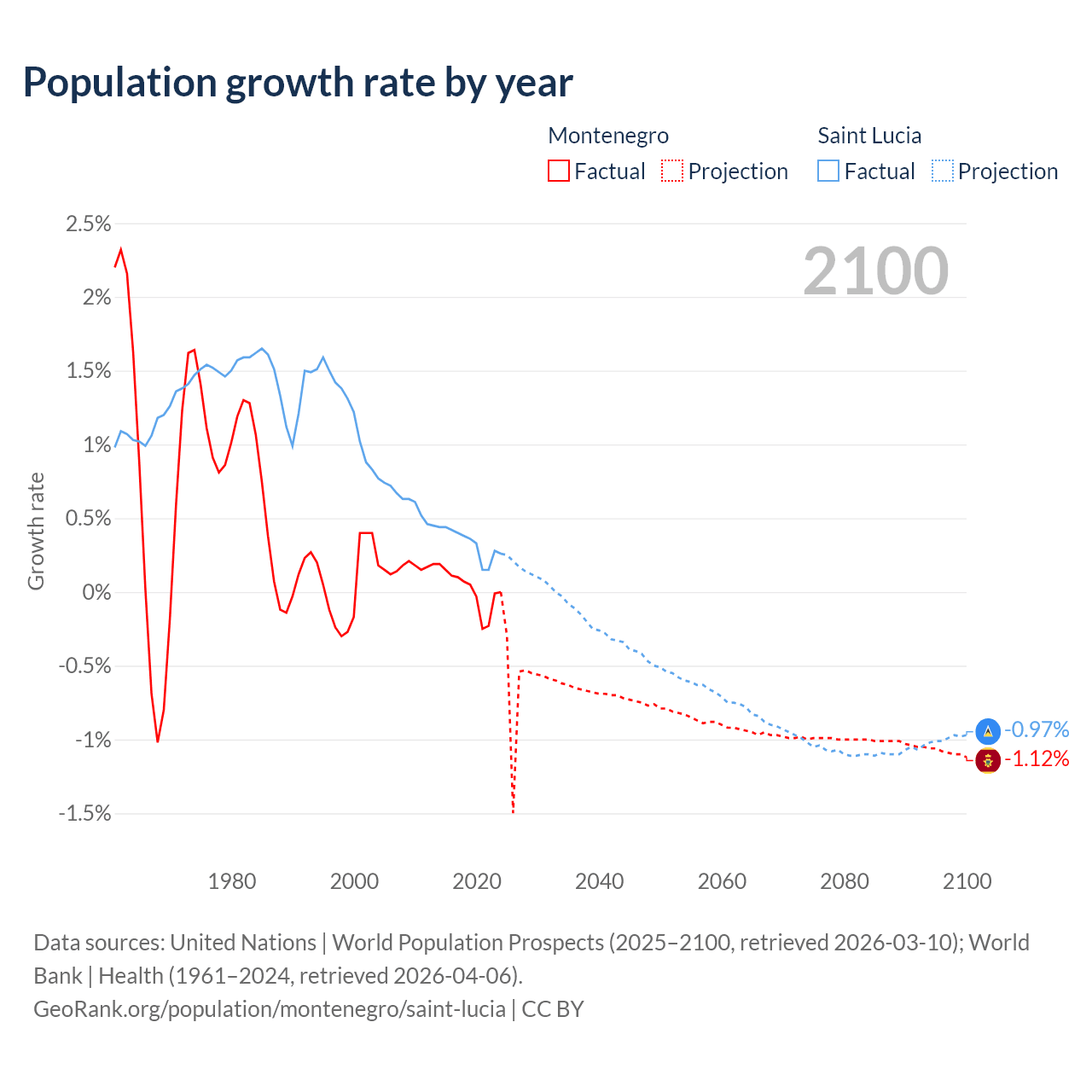 - For the last 10 years, Montenegro has had an average growth rate of +0.01% per year vs +0.33% in Saint Lucia.