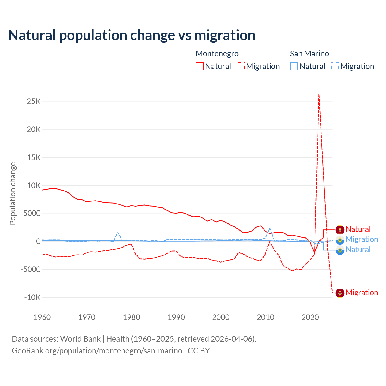 Over the last 10 years, 52.4% of the population change in Montenegro is from natural causes (a gain of 4,501 people) and 47.6% is from migration (a gain of 4,095 people). In San Marino 40.9% is from natural causes (a loss of 358 people) and 59.1% is from migration (a gain of 517 people).