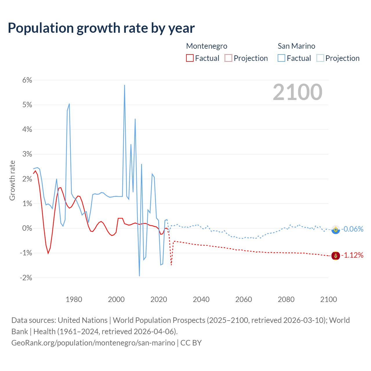 - For the last 10 years, Montenegro has had an average growth rate of +0.01% per year vs +0.26% in San Marino.