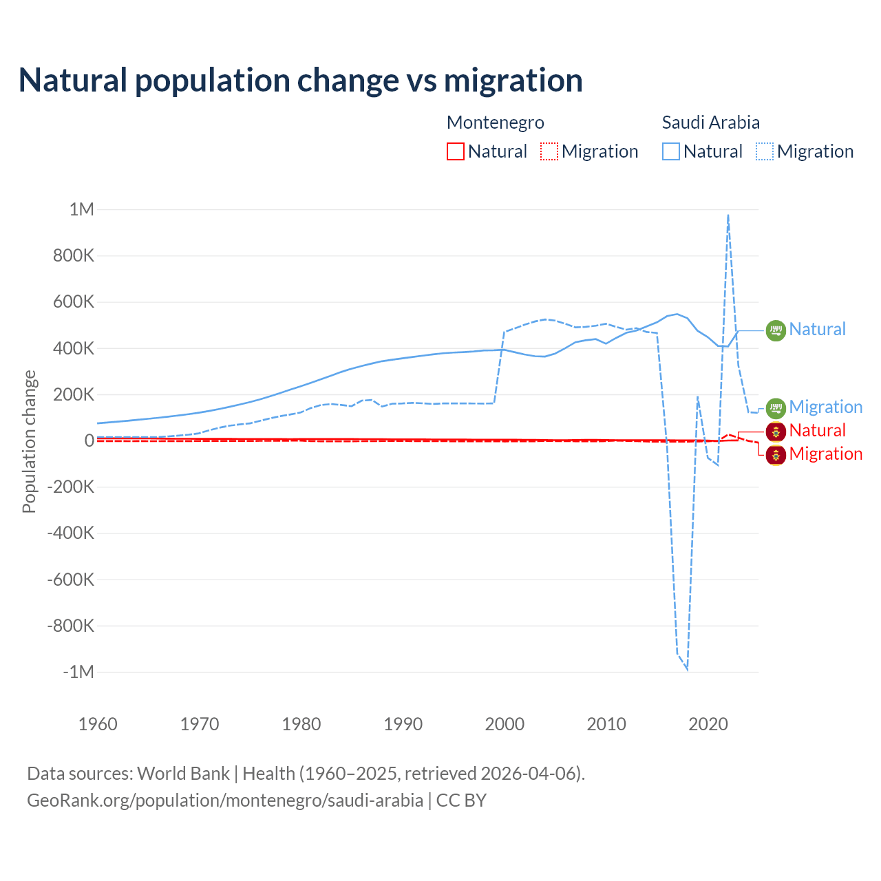 Over the last 10 years, 52.4% of the population change in Montenegro is from natural causes (a gain of 4,501 people) and 47.6% is from migration (a gain of 4,095 people). In Saudi Arabia 93.9% is from natural causes (a gain of 4,829,562 people) and 6.05% is from migration (a gain of 311,209 people).