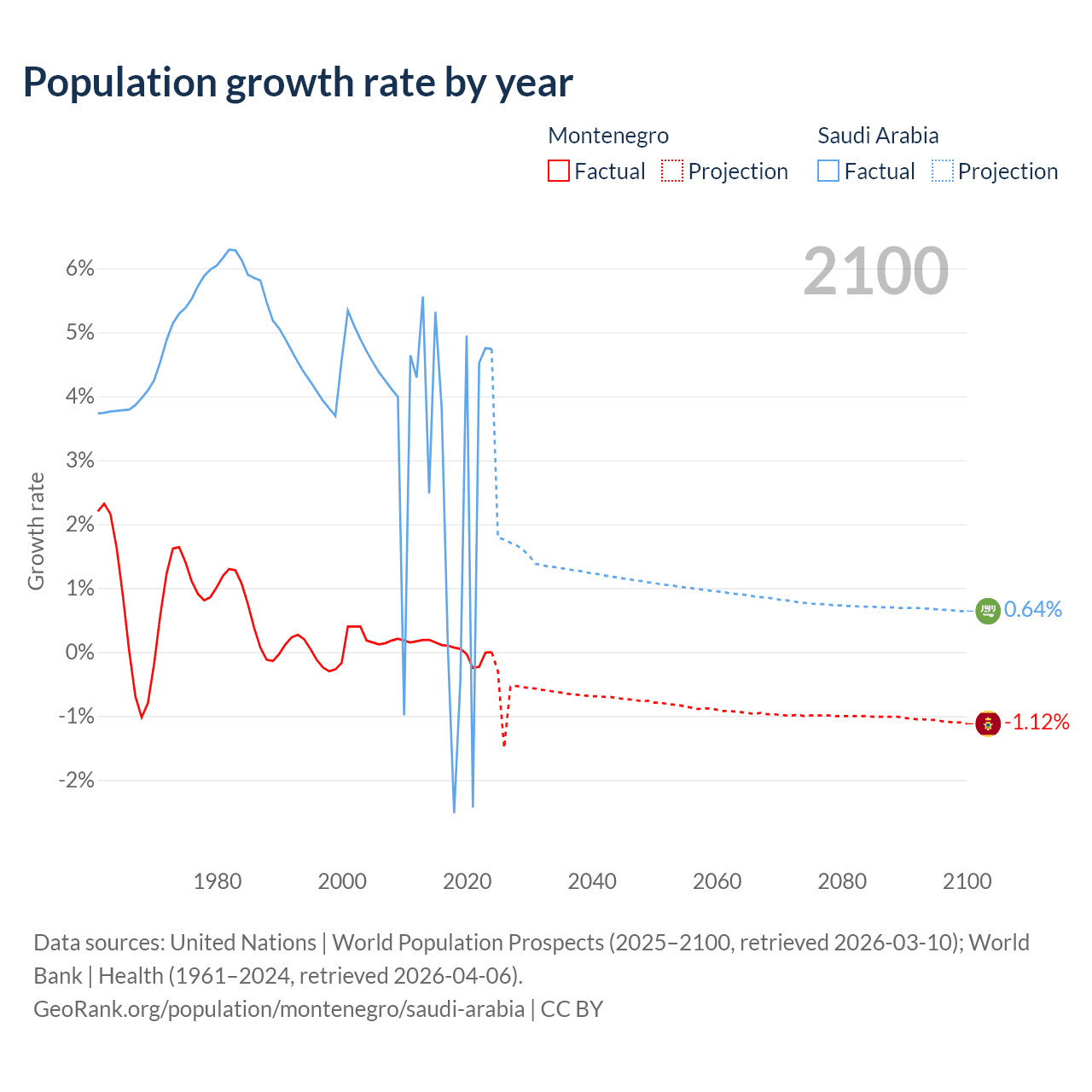 - For the last 10 years, Montenegro has had an average growth rate of +0.01% per year vs +2.3% in Saudi Arabia.