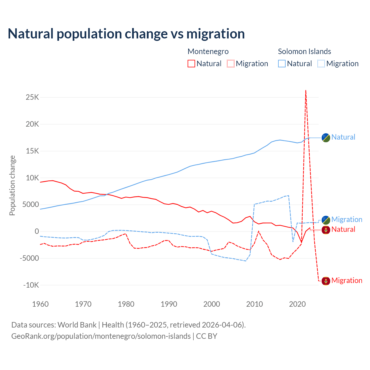 Over the last 10 years, 52.4% of the population change in Montenegro is from natural causes (a gain of 4,501 people) and 47.6% is from migration (a gain of 4,095 people). In the Solomon Islands 82.8% is from natural causes (a gain of 168,727 people) and 17.2% is from migration (a gain of 35,031 people).