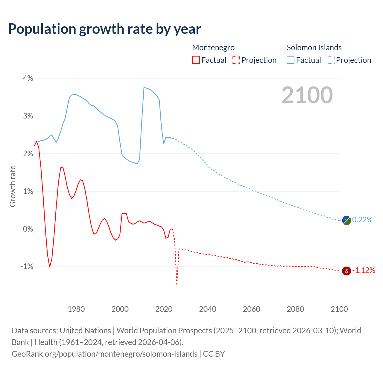 - For the last 10 years, Montenegro has had an average growth rate of +0.01% per year vs +2.95% in the Solomon Islands.