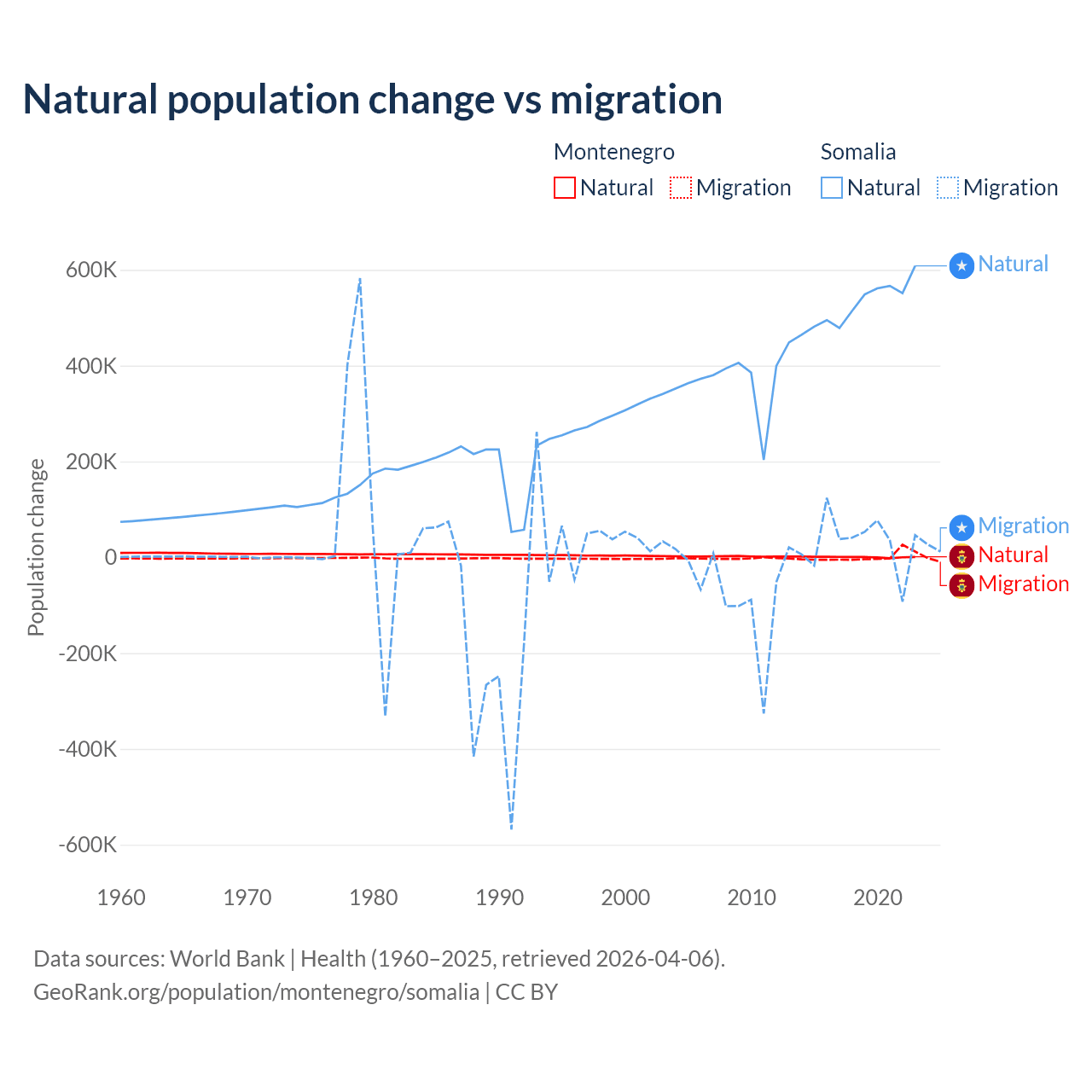 Over the last 10 years, 52.4% of the population change in Montenegro is from natural causes (a gain of 4,501 people) and 47.6% is from migration (a gain of 4,095 people). In Somalia 94.4% is from natural causes (a gain of 5,270,105 people) and 5.58% is from migration (a gain of 311,487 people).