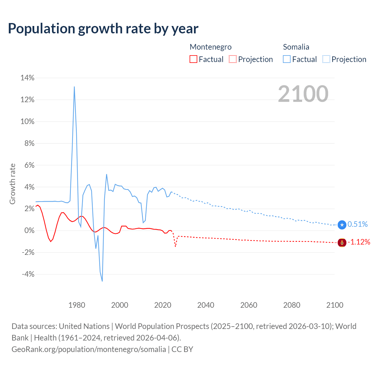 - For the last 10 years, Montenegro has had an average growth rate of +0.01% per year vs +3.61% in Somalia.