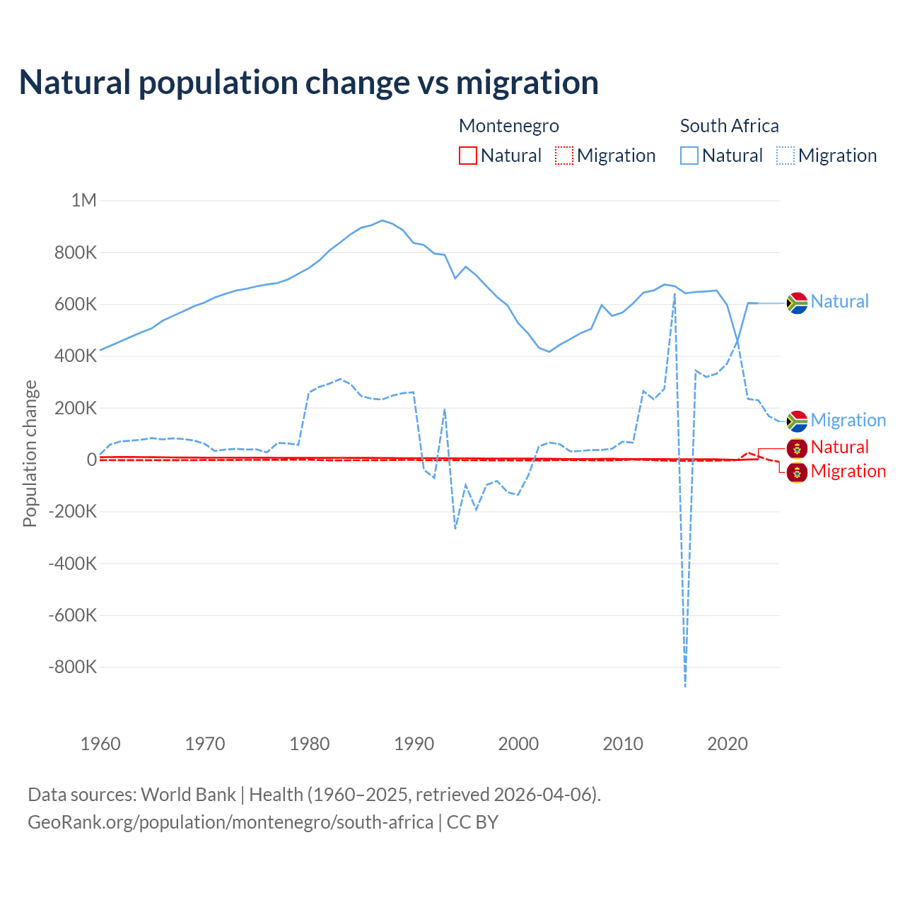 Over the last 10 years, 52.4% of the population change in Montenegro is from natural causes (a gain of 4,501 people) and 47.6% is from migration (a gain of 4,095 people). In South Africa 72.8% is from natural causes (a gain of 6,190,027 people) and 27.2% is from migration (a gain of 2,316,795 people).