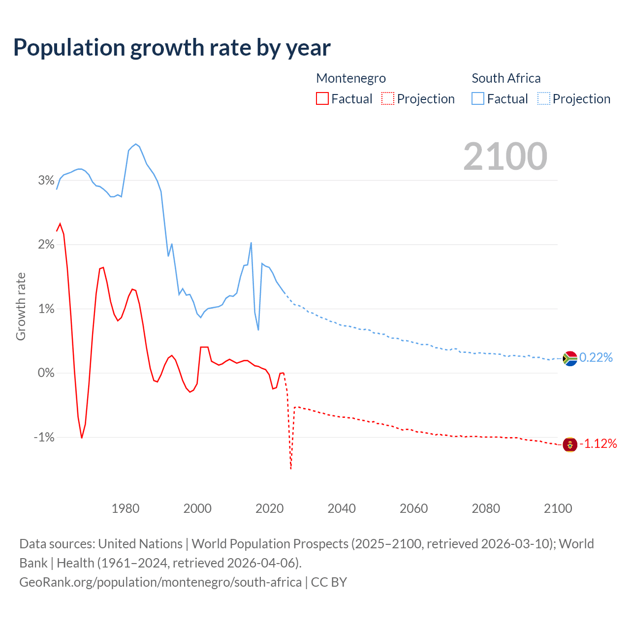 - For the last 10 years, Montenegro has had an average growth rate of +0.01% per year vs +1.44% in South Africa.