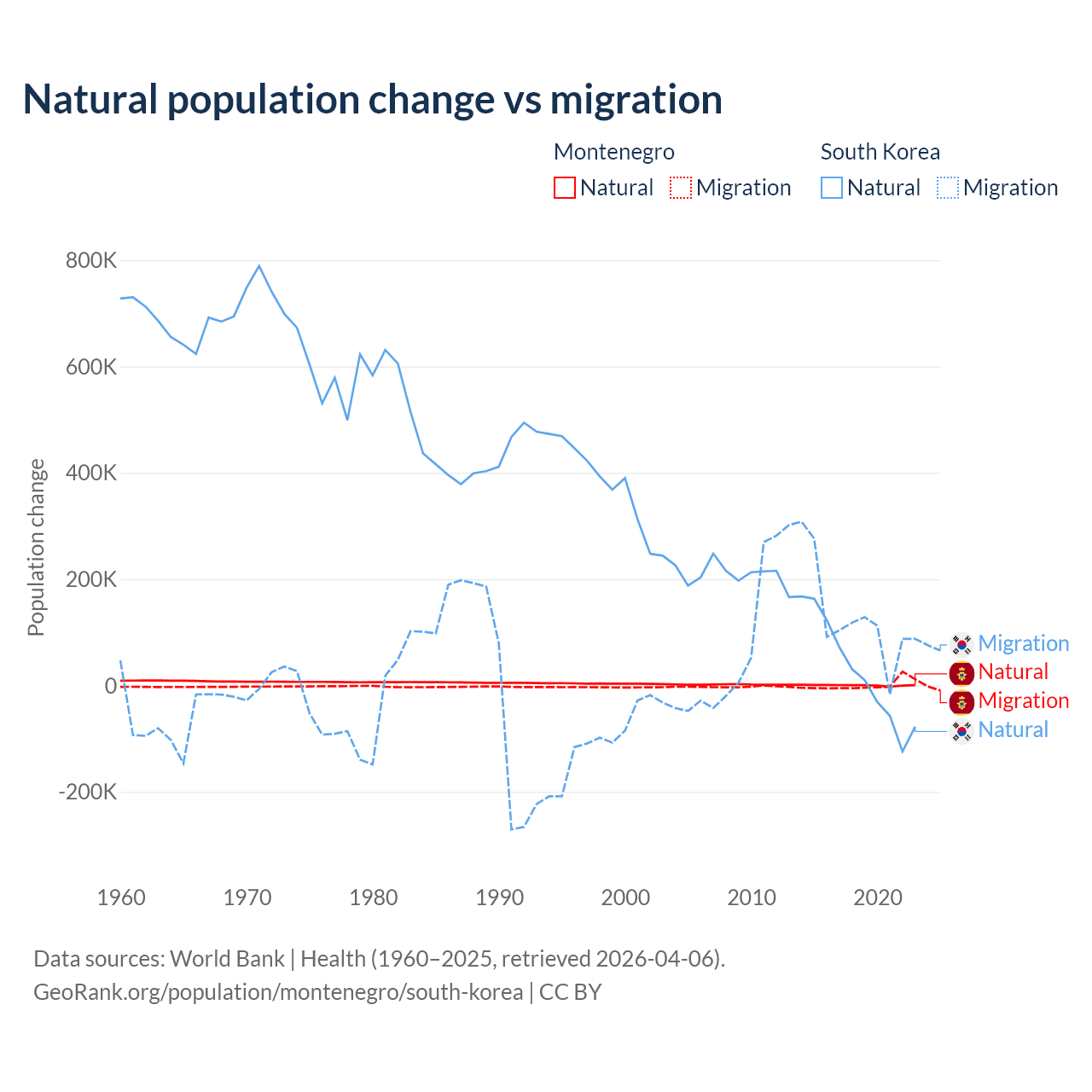 Over the last 10 years, 52.4% of the population change in Montenegro is from natural causes (a gain of 4,501 people) and 47.6% is from migration (a gain of 4,095 people). In South Korea 17.6% is from natural causes (a gain of 277,215 people) and 82.4% is from migration (a gain of 1,298,356 people).