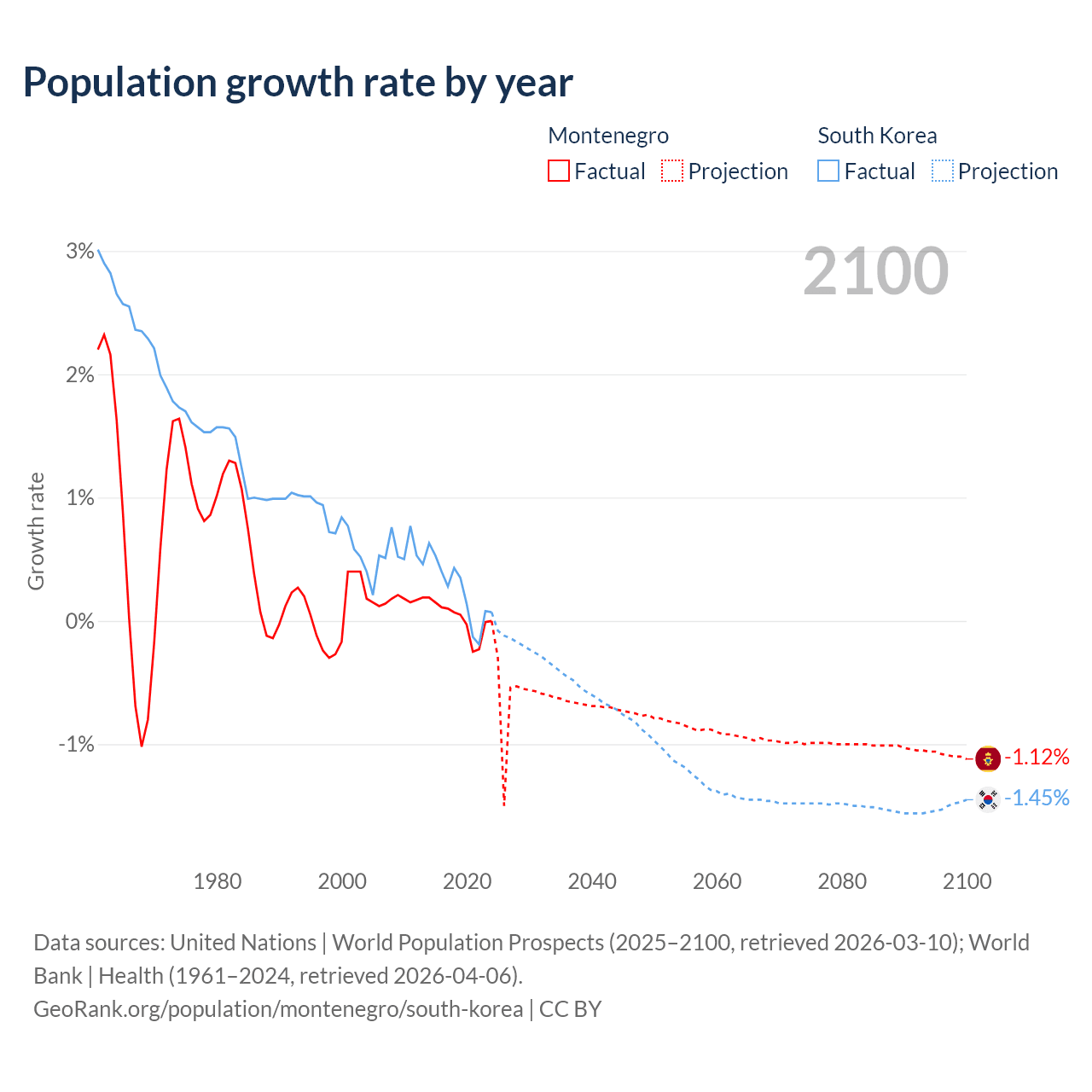 - For the last 10 years, Montenegro has had an average growth rate of +0.01% per year vs +0.24% in South Korea.