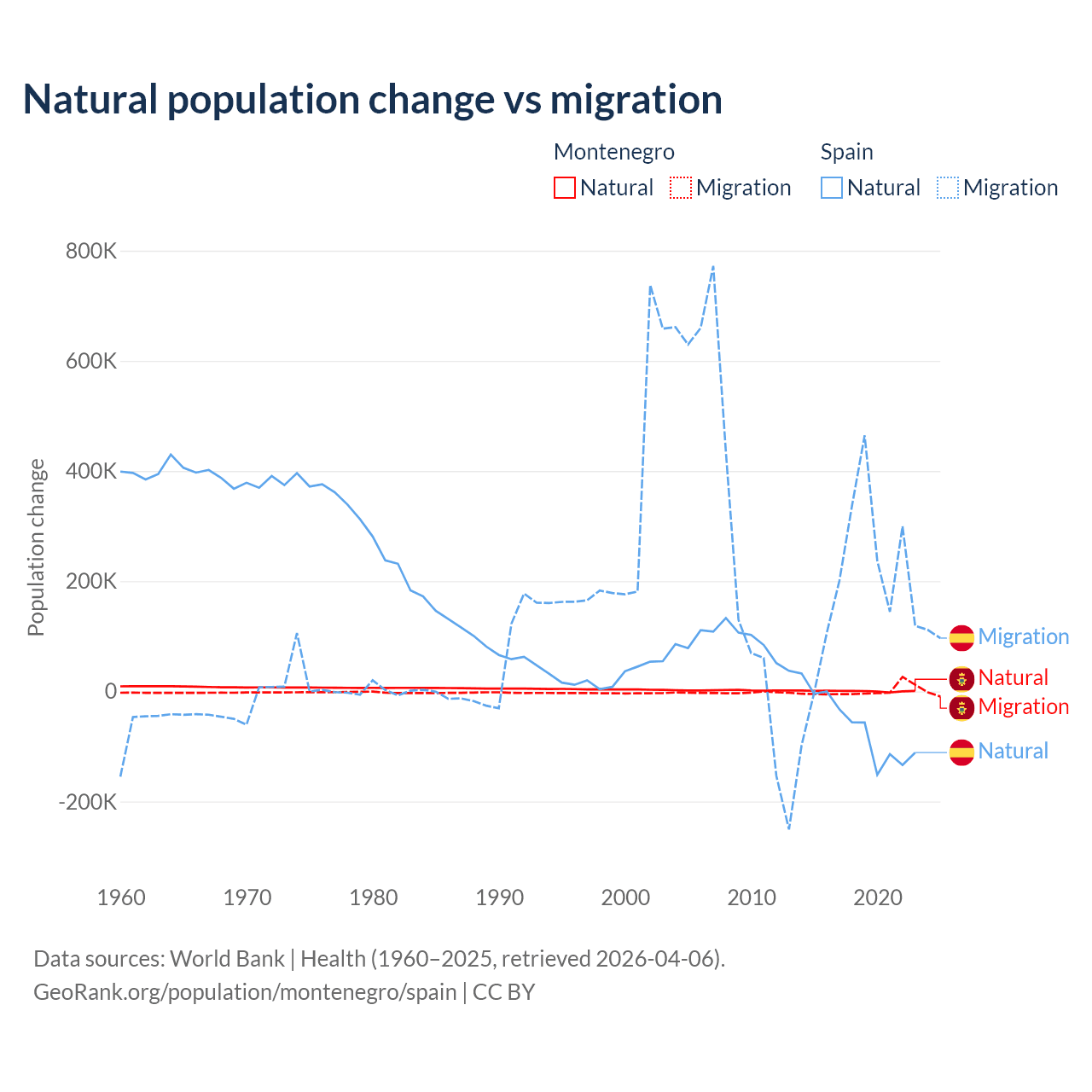 Over the last 10 years, 52.4% of the population change in Montenegro is from natural causes (a gain of 4,501 people) and 47.6% is from migration (a gain of 4,095 people). In Spain 25.8% is from natural causes (a loss of 627,829 people) and 74.2% is from migration (a gain of 1,810,127 people).