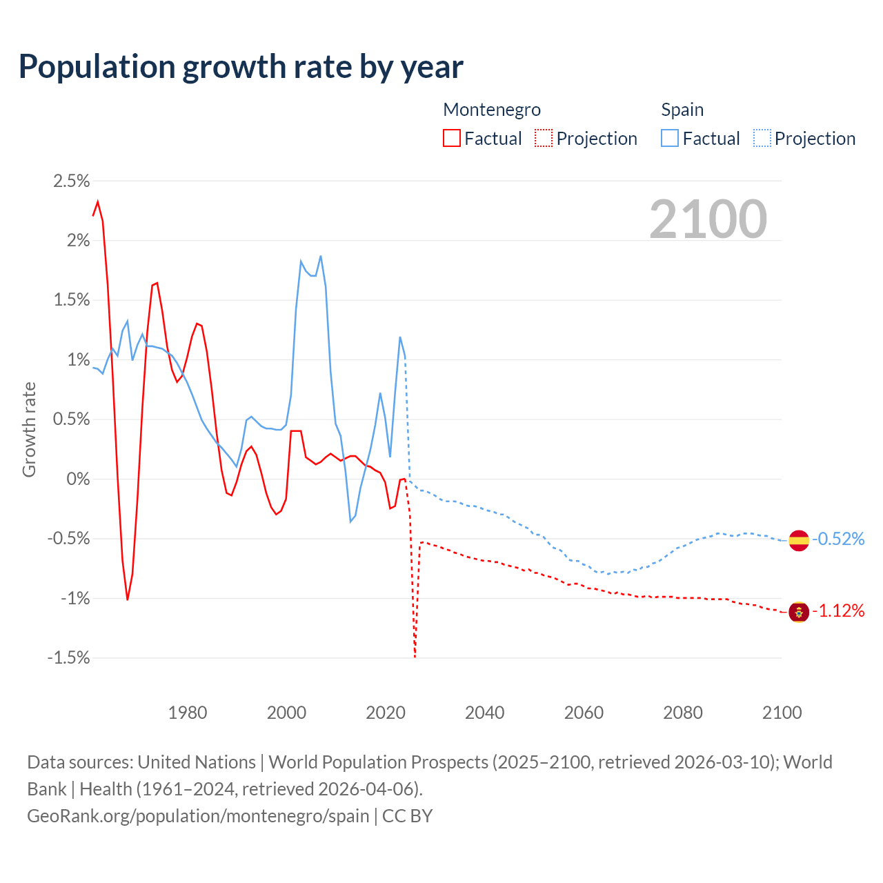 - For the last 10 years, Montenegro has had an average growth rate of +0.01% per year vs +0.43% in Spain.