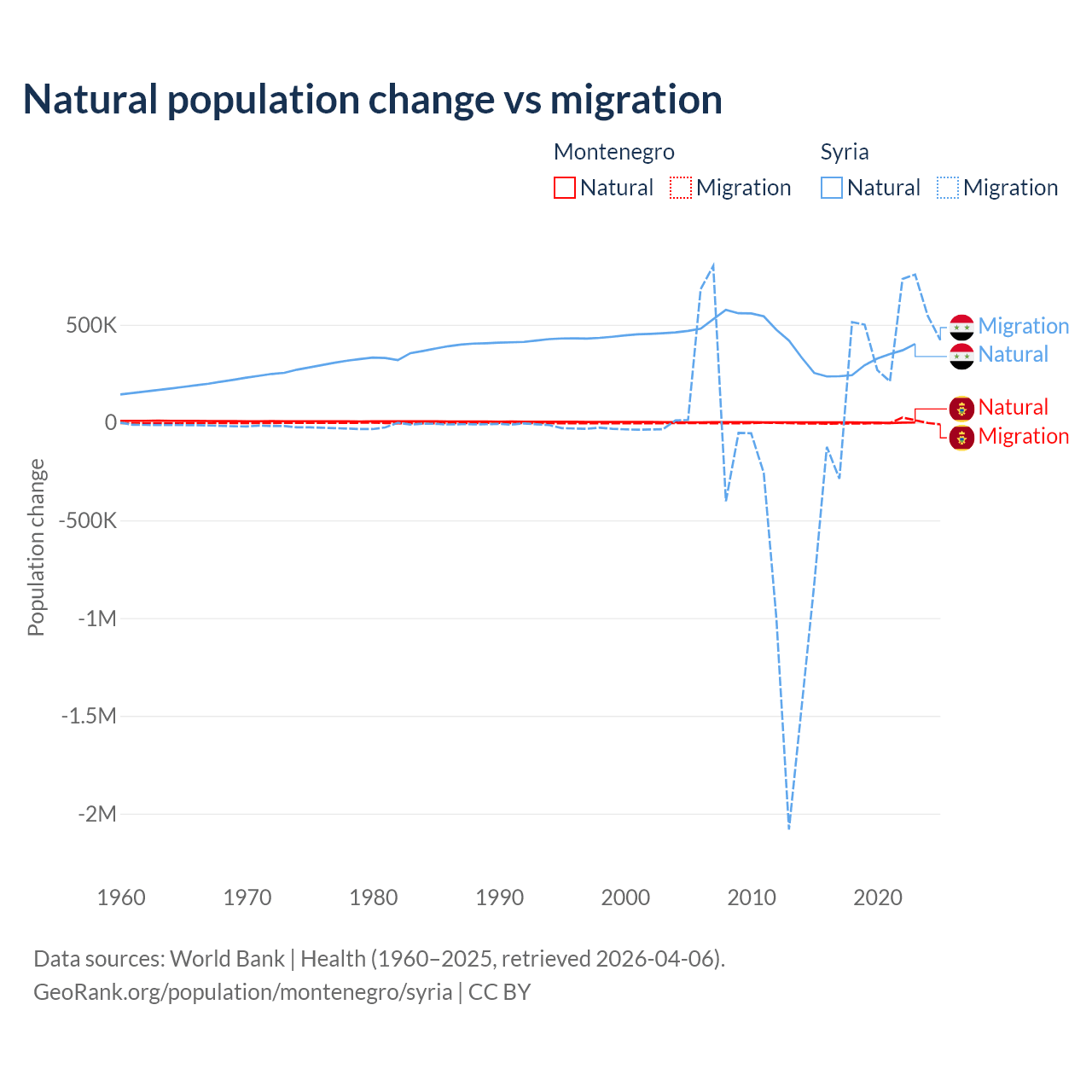 Over the last 10 years, 52.4% of the population change in Montenegro is from natural causes (a gain of 4,501 people) and 47.6% is from migration (a gain of 4,095 people). In Syria 91.3% is from natural causes (a gain of 3,047,621 people) and 8.72% is from migration (a gain of 291,069 people).