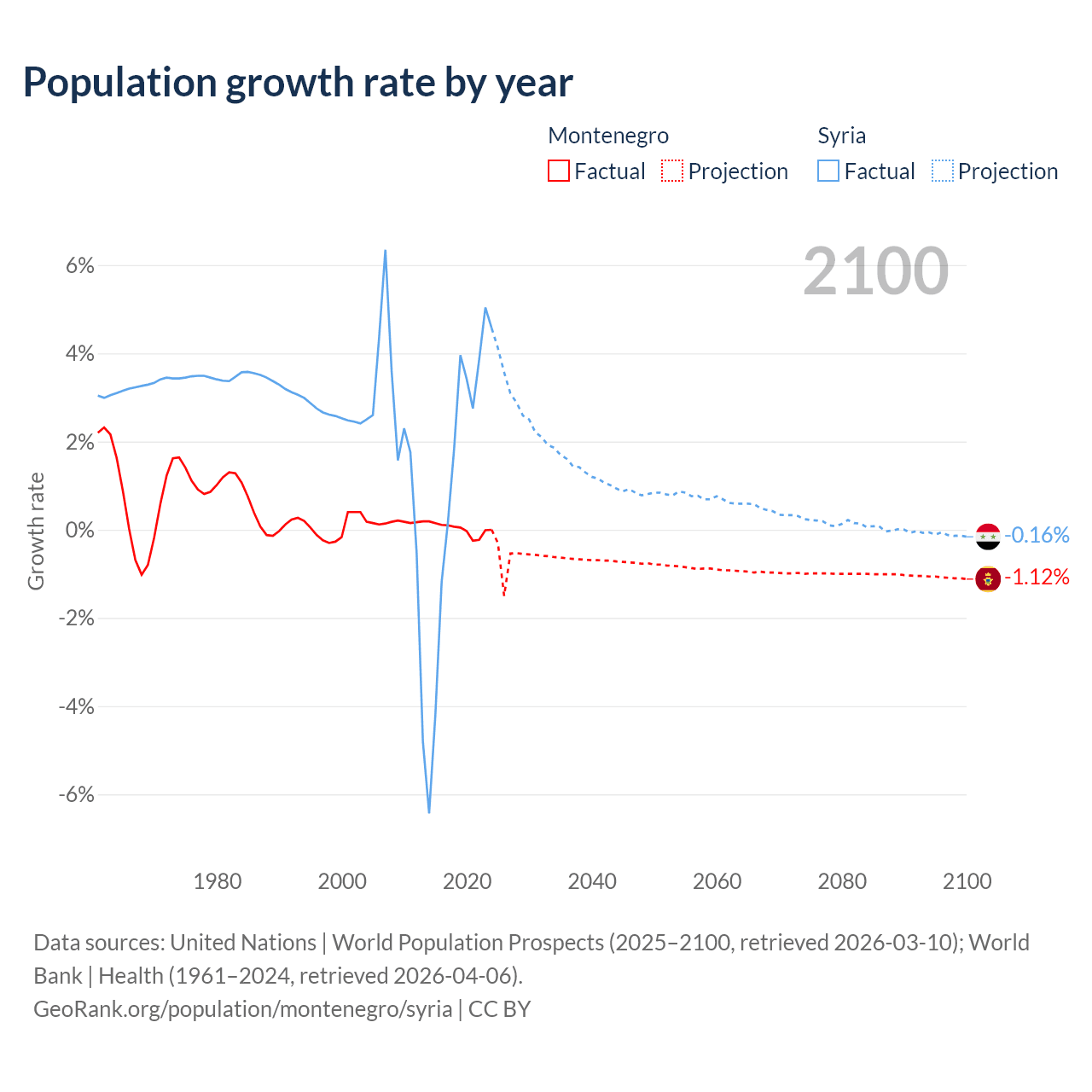 - For the last 10 years, Montenegro has had an average growth rate of +0.01% per year vs +1.25% in Syria.