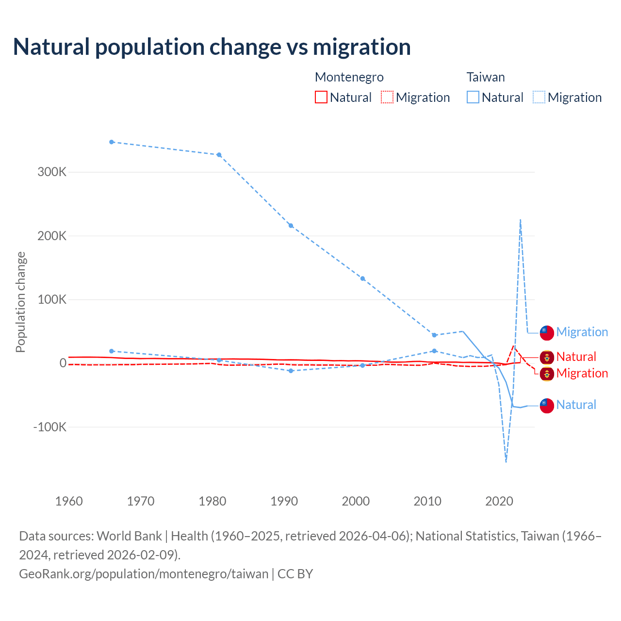 Over the last 10 years, 52.4% of the population change in Montenegro is from natural causes (a gain of 4,501 people) and 47.6% is from migration (a gain of 4,095 people). In Taiwan 56.7% is from natural causes (a loss of 57,467 people) and 43.3% is from migration (a gain of 43,884 people).