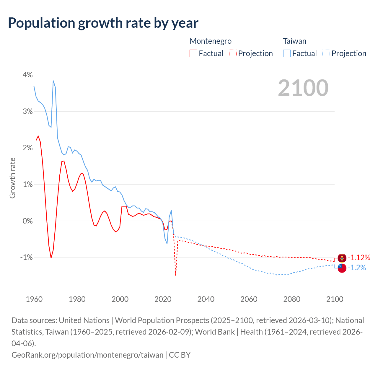 - For the last 10 years, Montenegro has had an average growth rate of +0.01% per year vs -0.03% in Taiwan.
