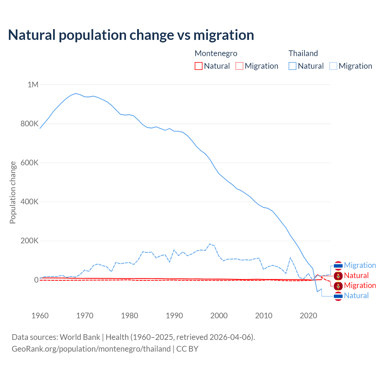Over the last 10 years, 52.4% of the population change in Montenegro is from natural causes (a gain of 4,501 people) and 47.6% is from migration (a gain of 4,095 people). In Thailand 78.4% is from natural causes (a gain of 1,292,528 people) and 21.6% is from migration (a gain of 355,361 people).