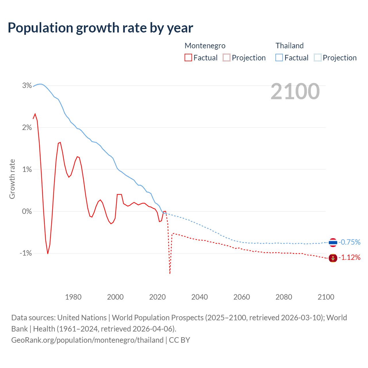 - For the last 10 years, Montenegro has had an average growth rate of +0.01% per year vs +0.23% in Thailand.