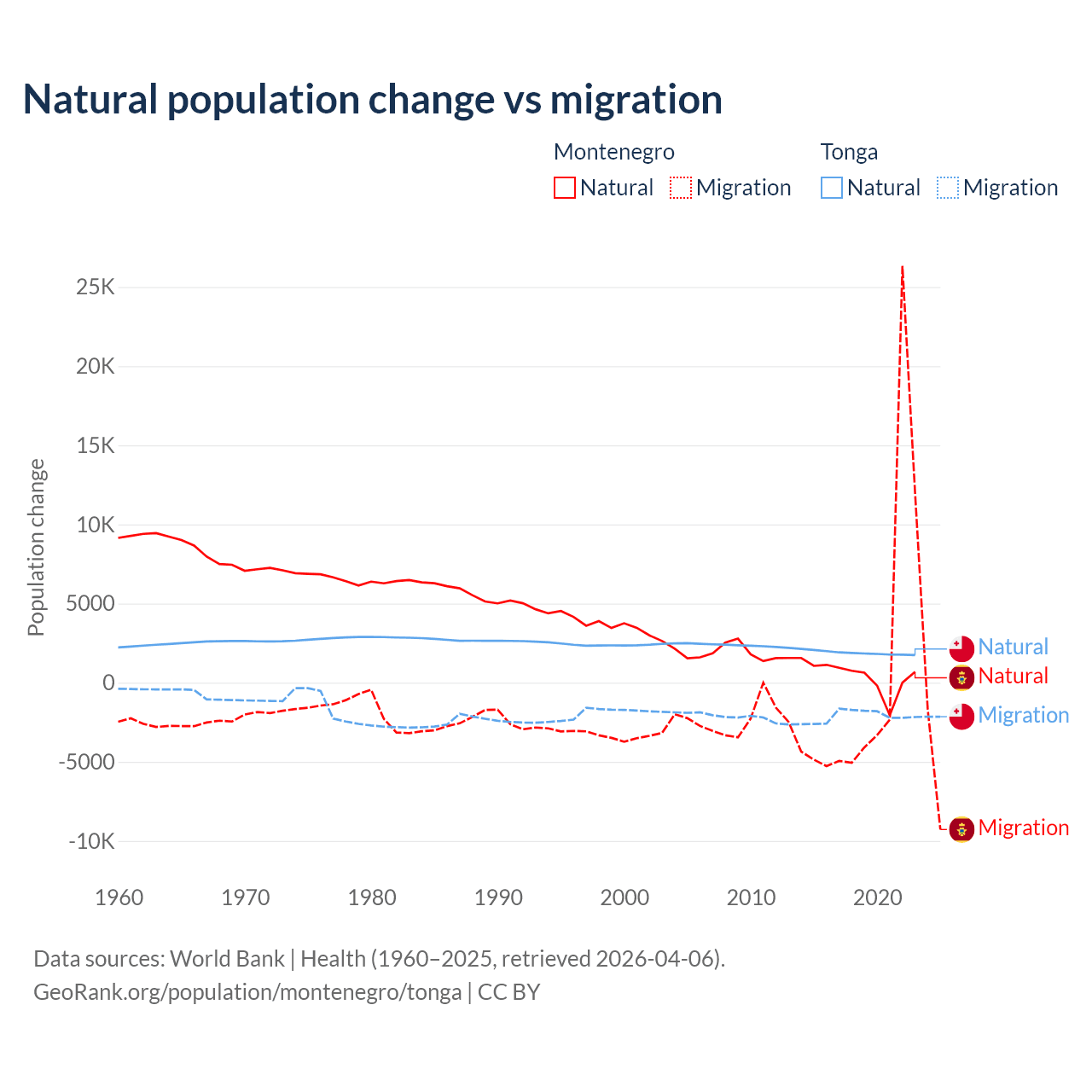 Over the last 10 years, 52.4% of the population change in Montenegro is from natural causes (a gain of 4,501 people) and 47.6% is from migration (a gain of 4,095 people). In Tonga 46.9% is from natural causes (a gain of 18,919 people) and 53.1% is from migration (a loss of 21,384 people).