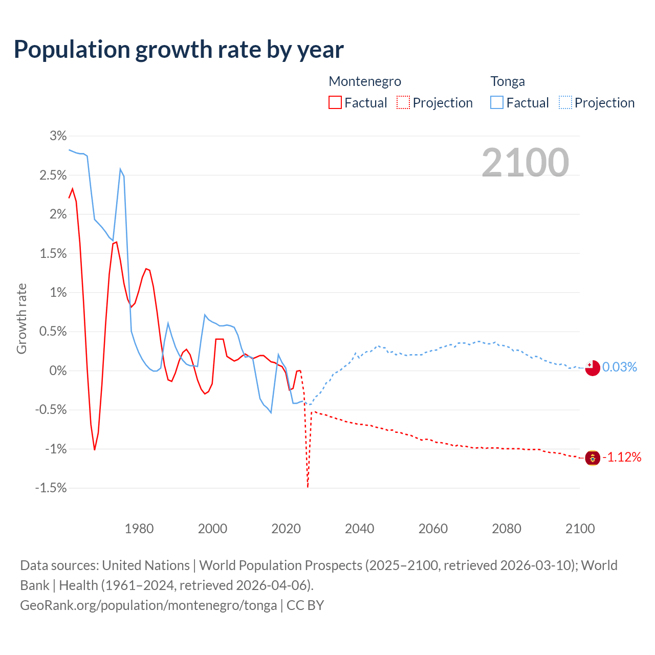 - For the last 10 years, Montenegro has had an average growth rate of +0.01% per year vs -0.25% in Tonga.