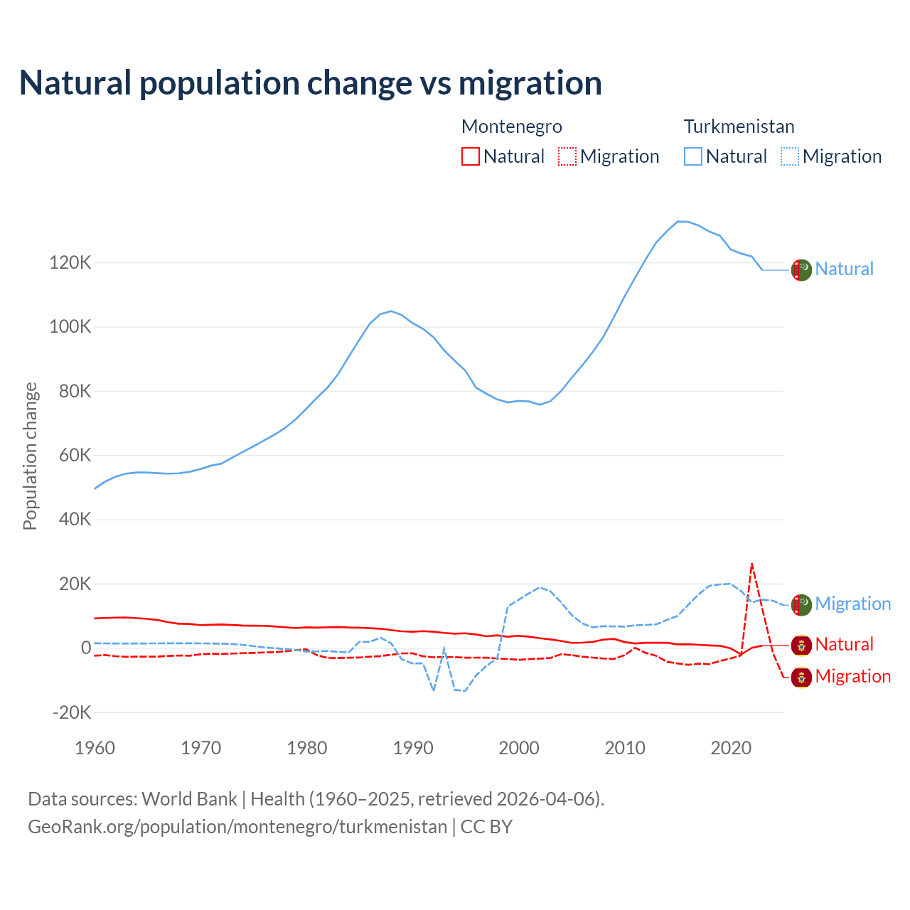 Over the last 10 years, 52.4% of the population change in Montenegro is from natural causes (a gain of 4,501 people) and 47.6% is from migration (a gain of 4,095 people). In Turkmenistan 89.2% is from natural causes (a gain of 1,270,228 people) and 10.8% is from migration (a gain of 154,379 people).