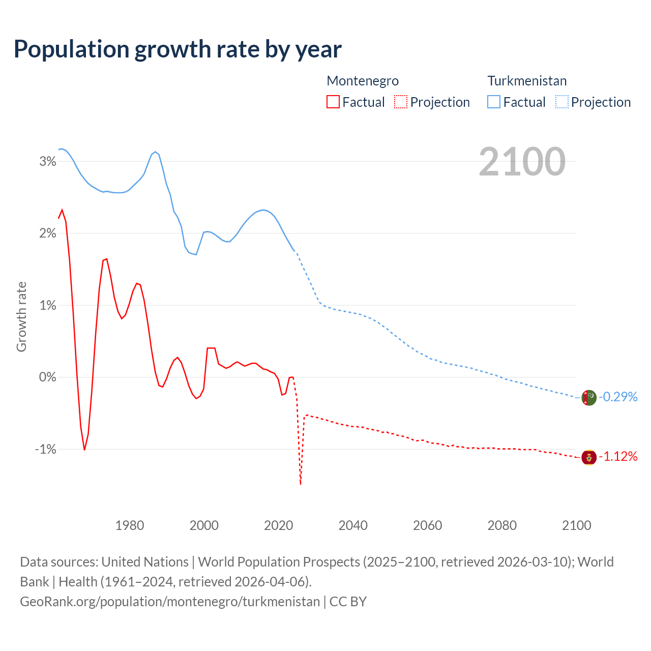- For the last 10 years, Montenegro has had an average growth rate of +0.01% per year vs +2.14% in Turkmenistan.