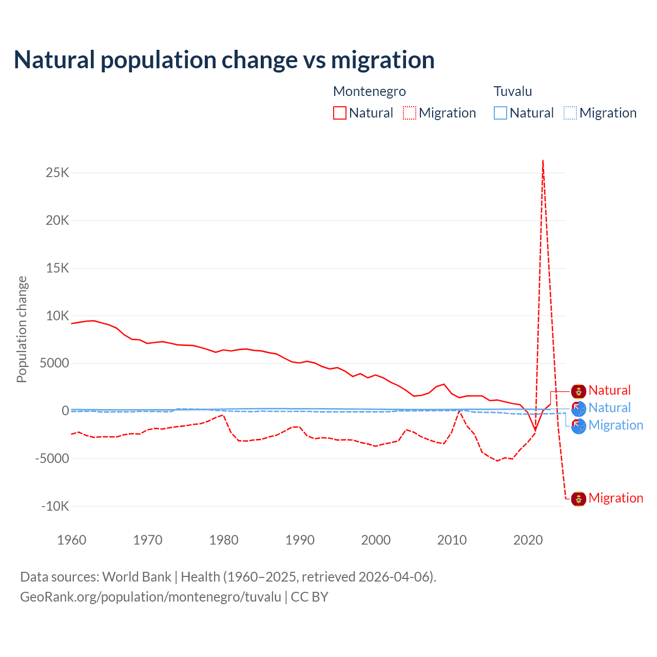 Over the last 10 years, 52.4% of the population change in Montenegro is from natural causes (a gain of 4,501 people) and 47.6% is from migration (a gain of 4,095 people). In Tuvalu 35.5% is from natural causes (a gain of 1,556 people) and 64.5% is from migration (a loss of 2,827 people).