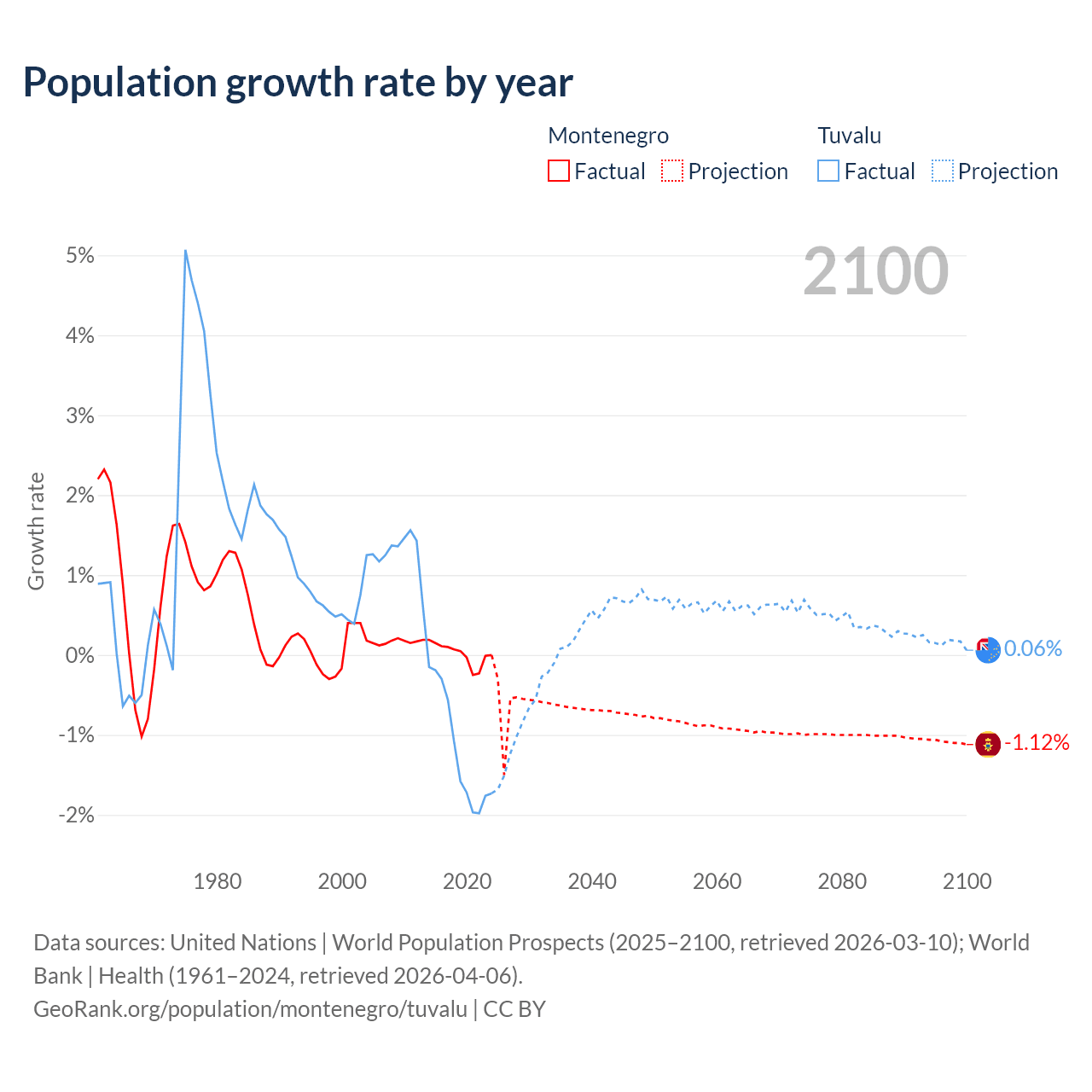 - For the last 10 years, Montenegro has had an average growth rate of +0.01% per year vs -1.19% in Tuvalu.