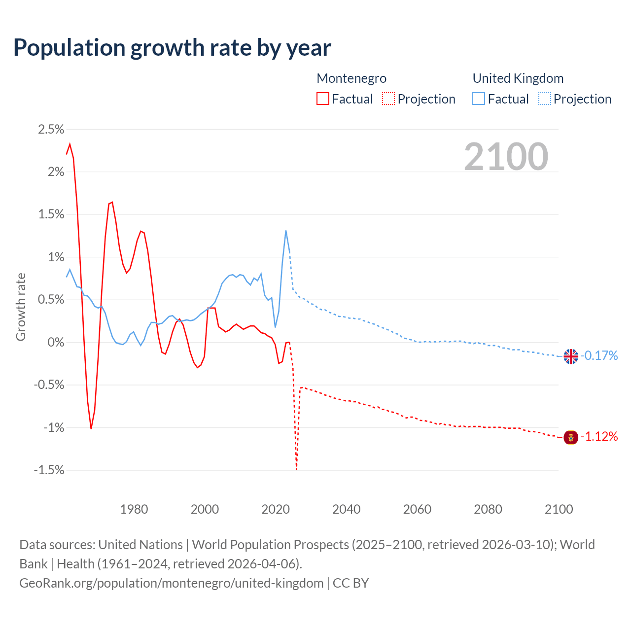- For the last 10 years, Montenegro has had an average growth rate of +0.01% per year vs +0.7% in the United Kingdom.