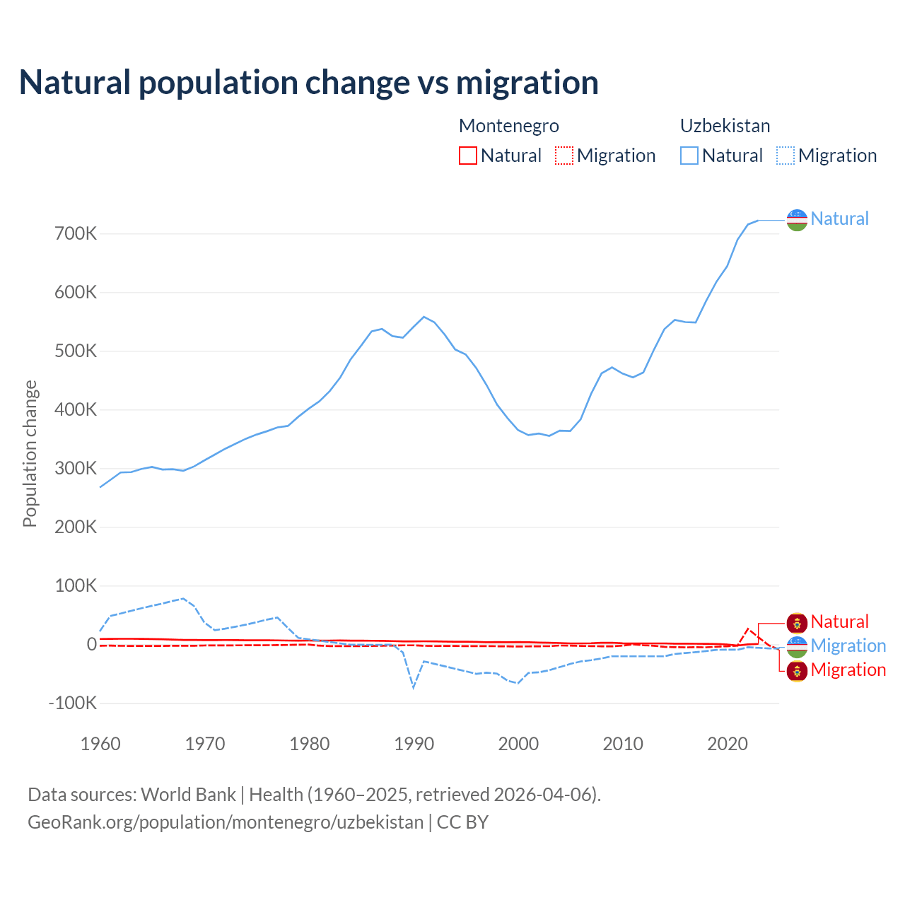 Over the last 10 years, 52.4% of the population change in Montenegro is from natural causes (a gain of 4,501 people) and 47.6% is from migration (a gain of 4,095 people). In Uzbekistan 98.2% is from natural causes (a gain of 6,161,117 people) and 1.84% is from migration (a loss of 115,398 people).