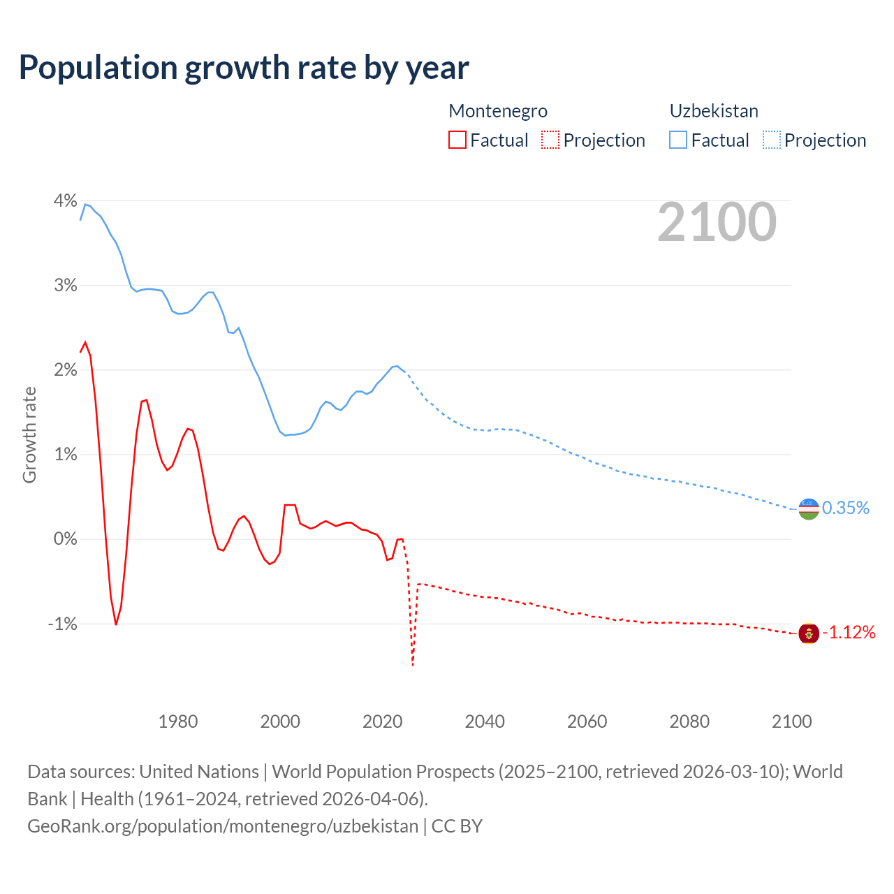 - For the last 10 years, Montenegro has had an average growth rate of +0.01% per year vs +1.85% in Uzbekistan.