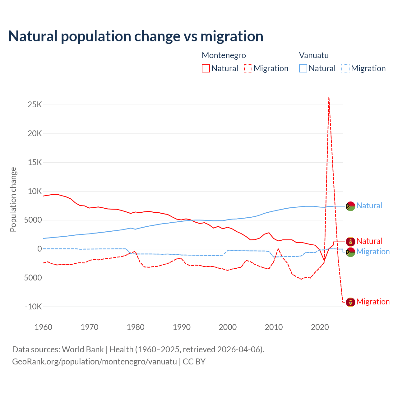 Over the last 10 years, 52.4% of the population change in Montenegro is from natural causes (a gain of 4,501 people) and 47.6% is from migration (a gain of 4,095 people). In Vanuatu 92.2% is from natural causes (a gain of 72,941 people) and 7.81% is from migration (a loss of 6,181 people).