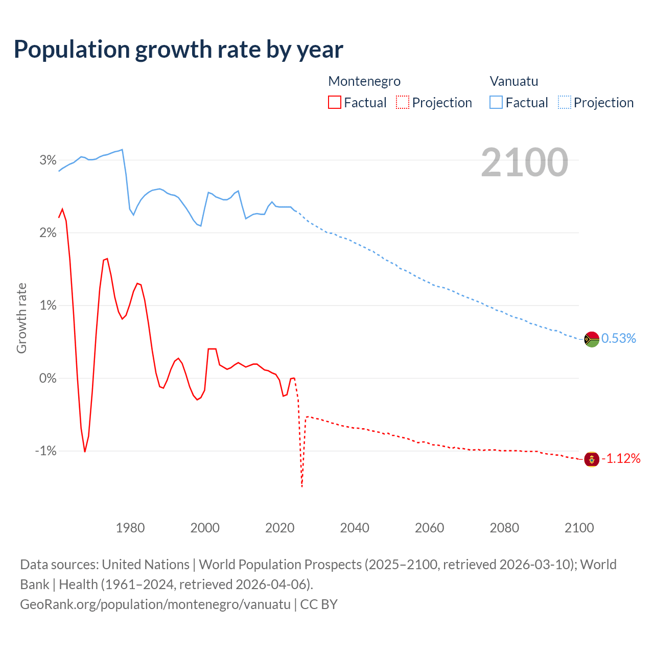 - For the last 10 years, Montenegro has had an average growth rate of +0.01% per year vs +2.33% in Vanuatu.
