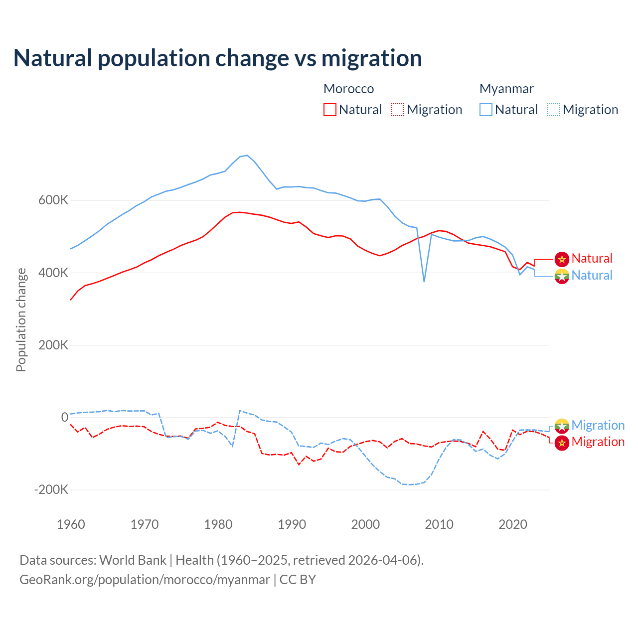 Over the last 10 years, 88.3% of the population change in Morocco is from natural causes (a gain of 4,495,223 people) and 11.7% is from migration (a loss of 594,083 people). In Myanmar 86% is from natural causes (a gain of 4,594,615 people) and 14% is from migration (a loss of 749,272 people).