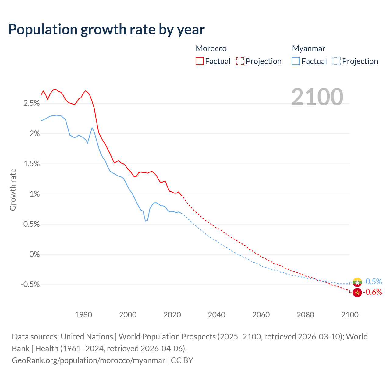 - For the last 10 years, Morocco has had an average growth rate of +1.09% per year vs +0.74% in Myanmar.