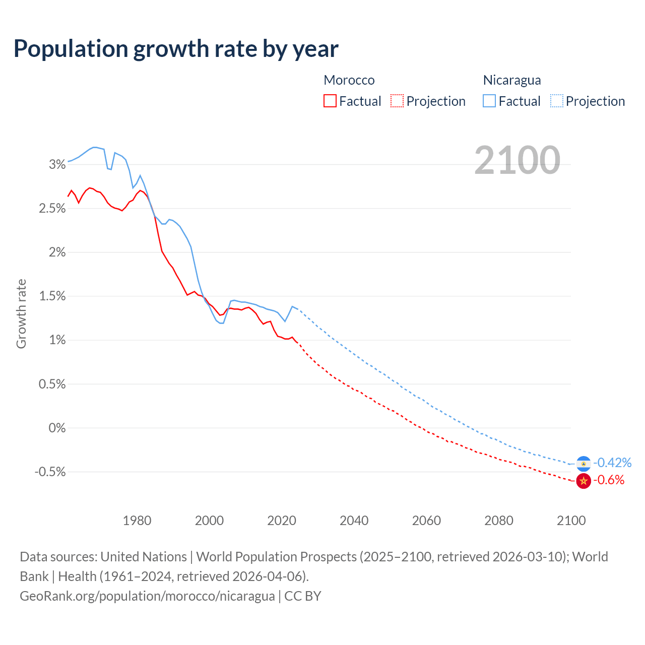 - For the last 10 years, Morocco has had an average growth rate of +1.09% per year vs +1.33% in Nicaragua.