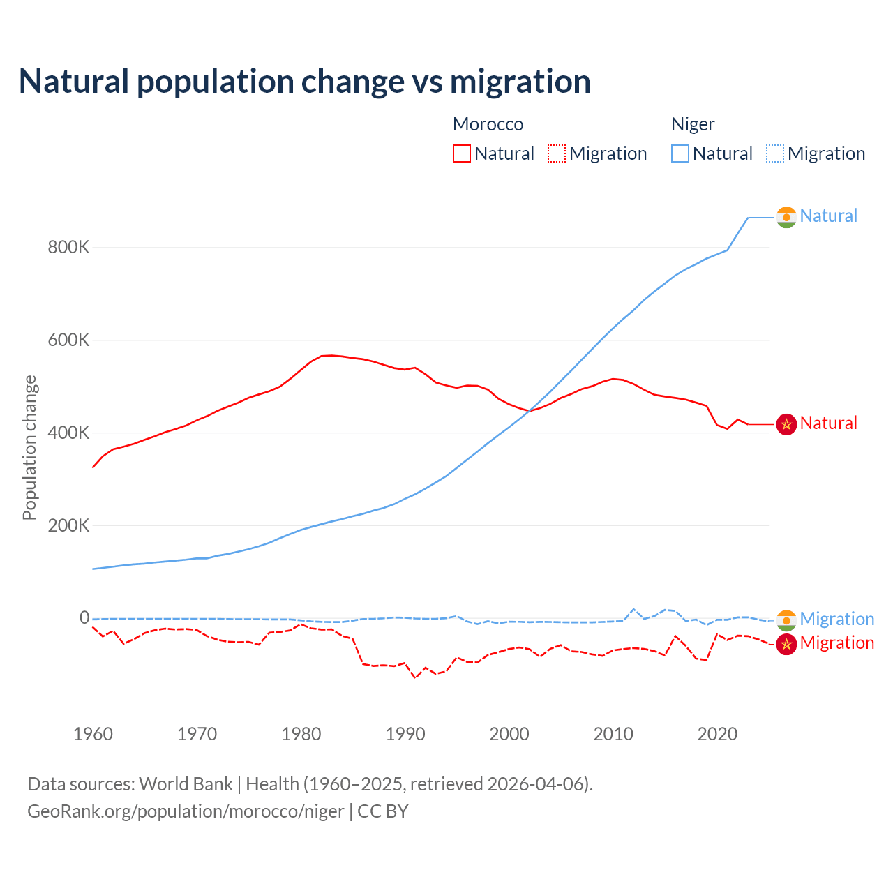 Over the last 10 years, 88.3% of the population change in Morocco is from natural causes (a gain of 4,495,223 people) and 11.7% is from migration (a loss of 594,083 people). In Niger 100% is from natural causes (a gain of 7,728,287 people) and 0.03% is from migration (a gain of 2,520 people).